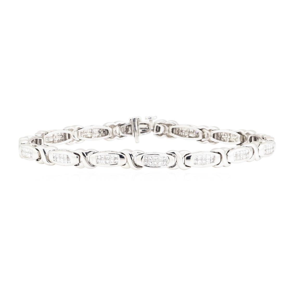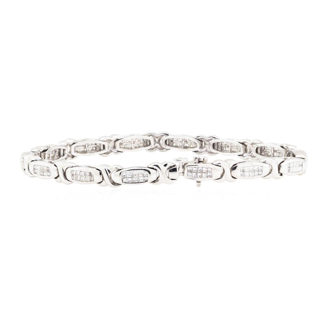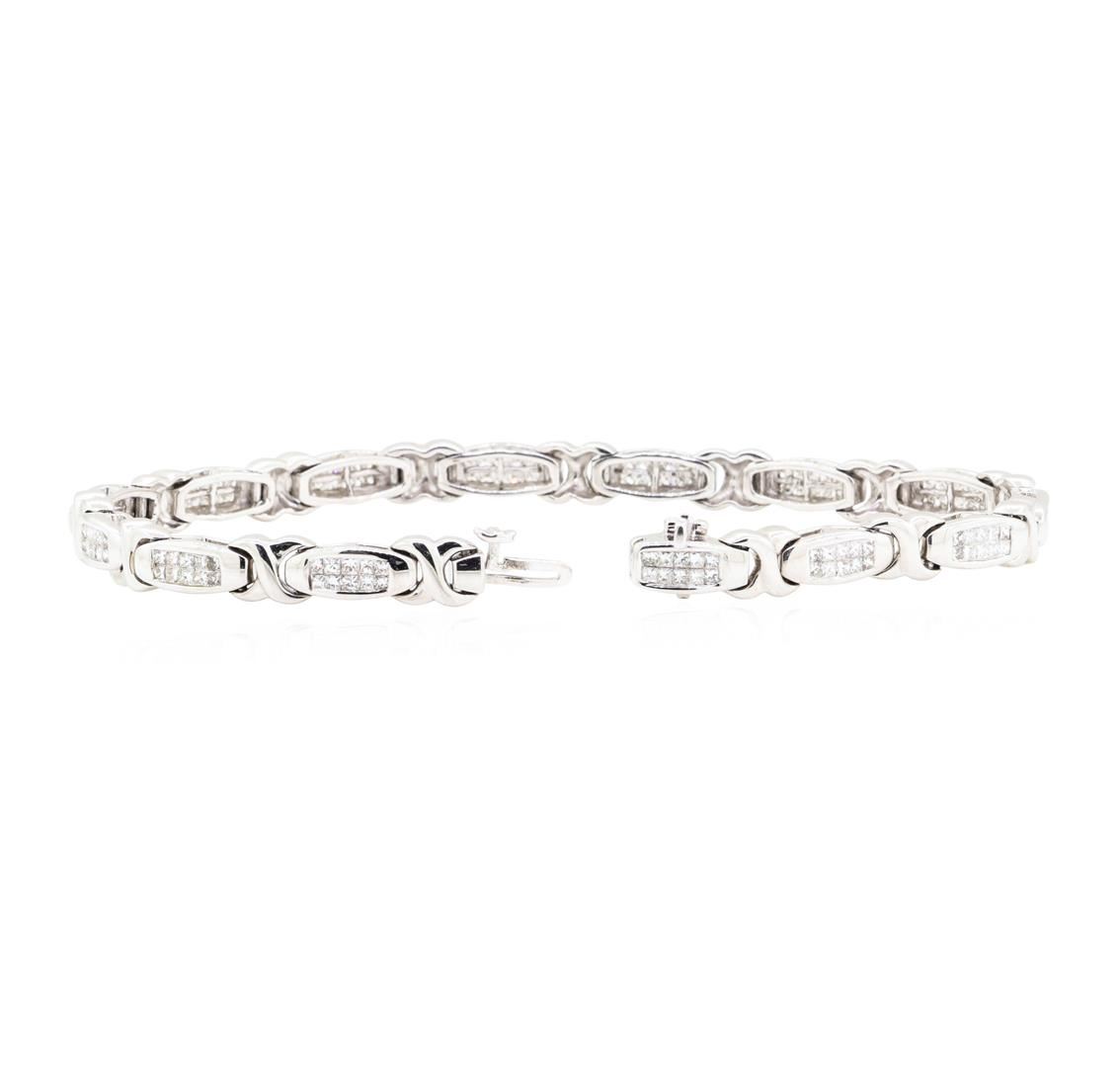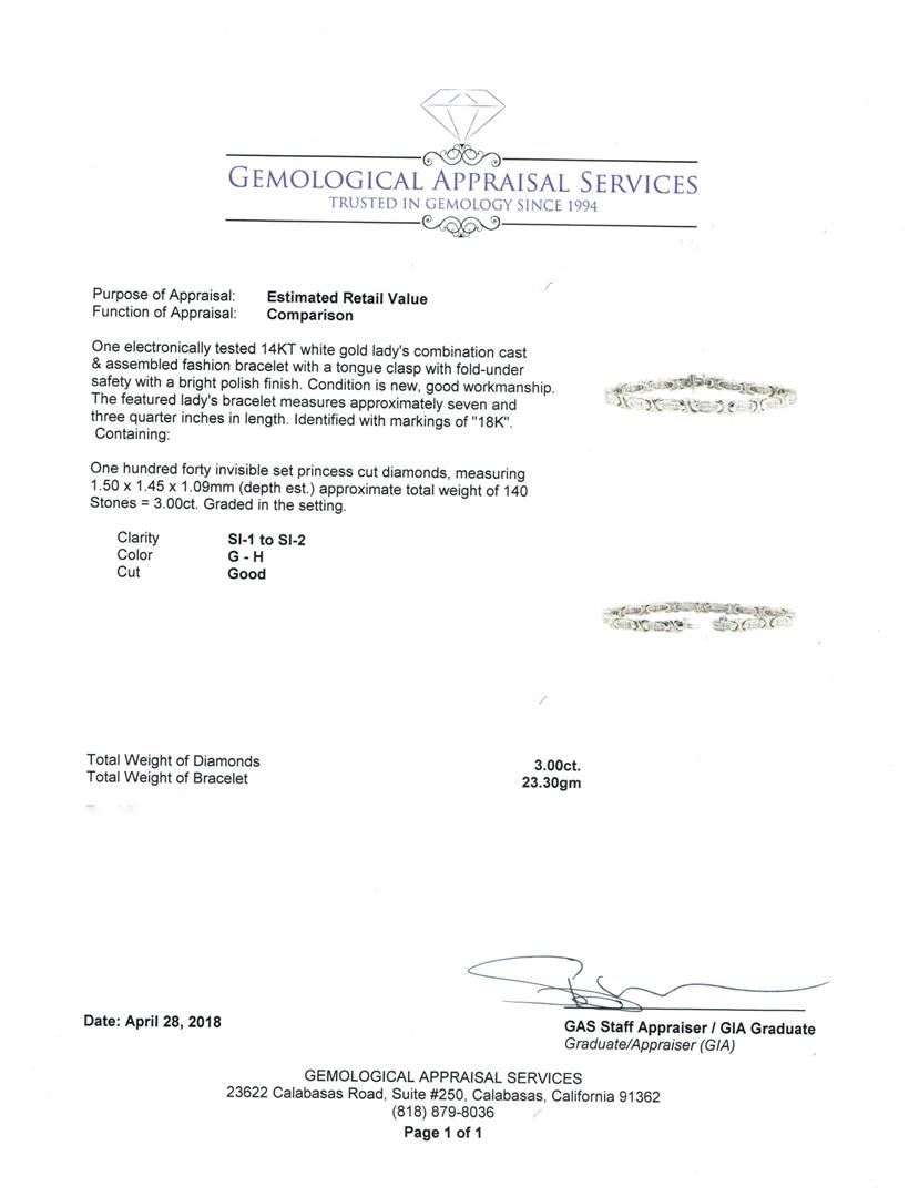 One electronically tested 14KT white gold Ladies combination cast & assembled fashion bracelet with a tongue clasp with fold-under safety with a bright polish finish. The featured Ladies bracelet measures approximately seven and three quarter inches in length. Identified with markings of '18K'. Condition is new, good workmanship. Containing: One Hundred Forty invisible set princess cut diamonds, measuring 1.50 x 1.45 x 1.09mm (depth est.) approximate total weight of 140 Stones = 3.00ct. Graded in the setting. Color G - H Clarity SI-1 to SI-2 Cut Good. Total Weight of Diamonds 3.00ct.. Total Weight of Bracelet 23.30gm. GAS Appraised.