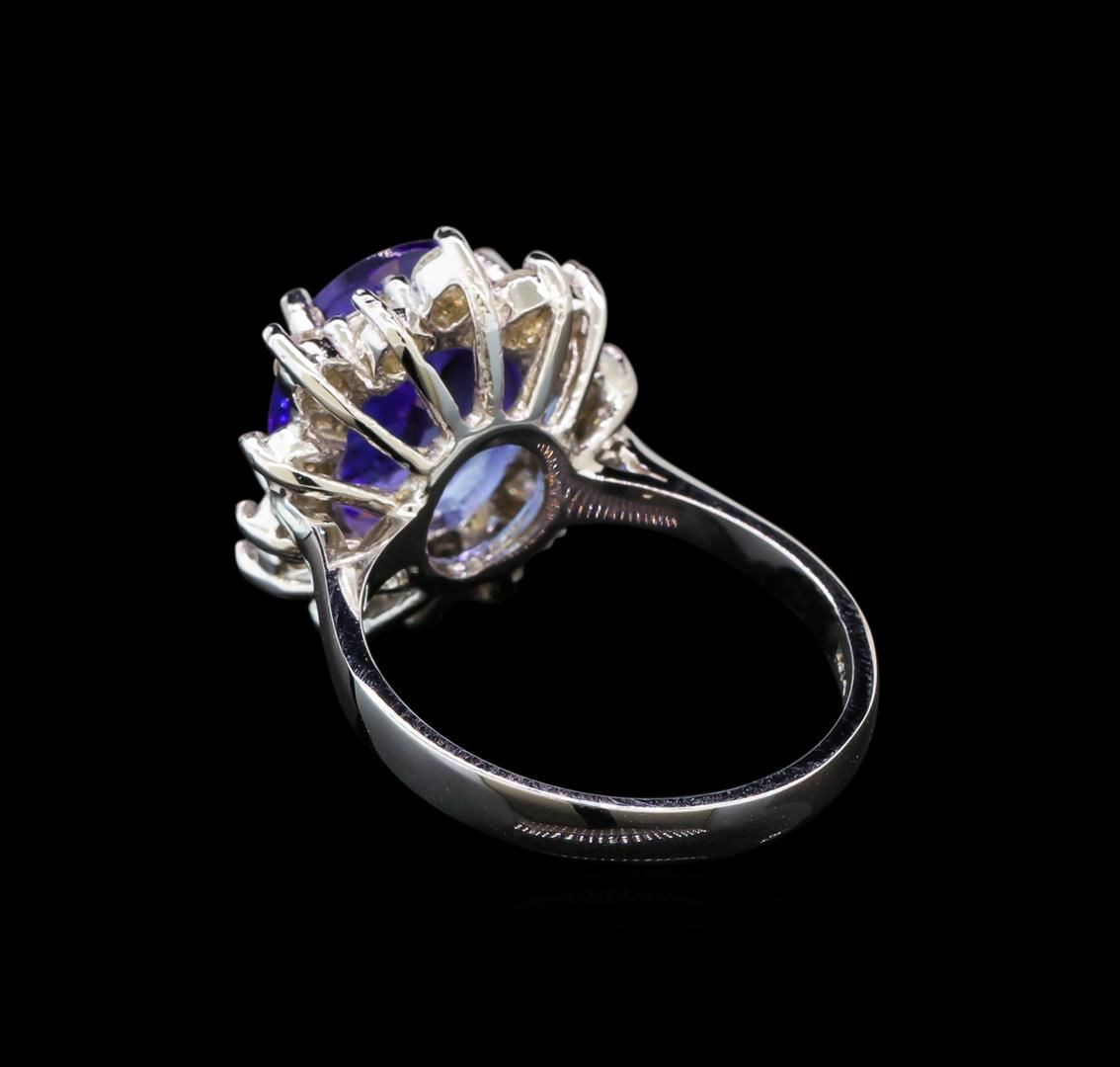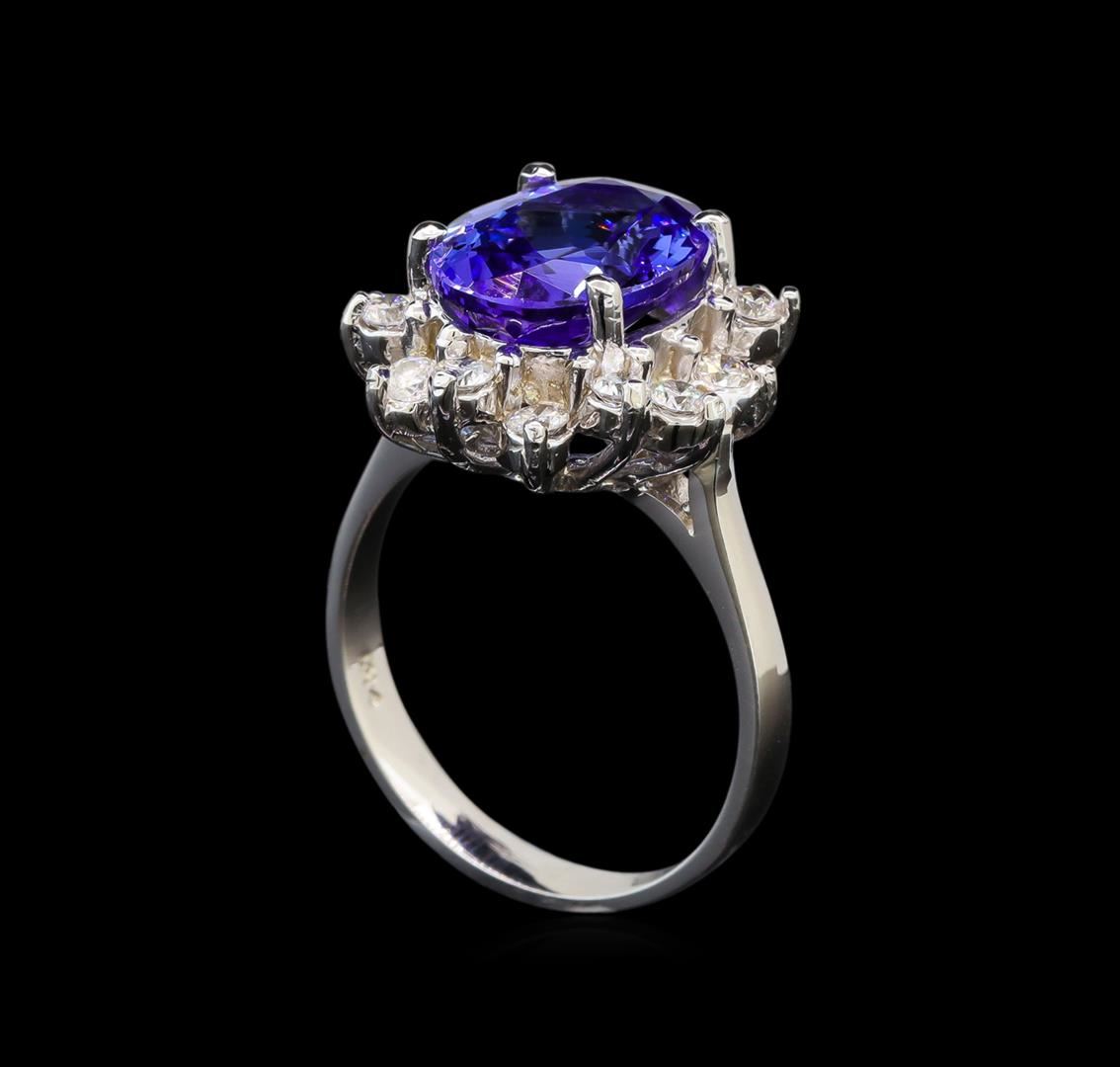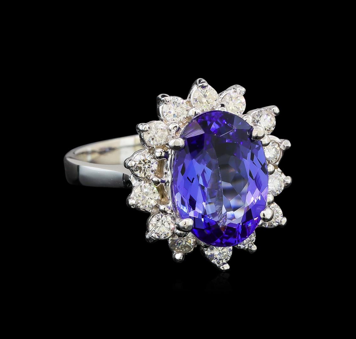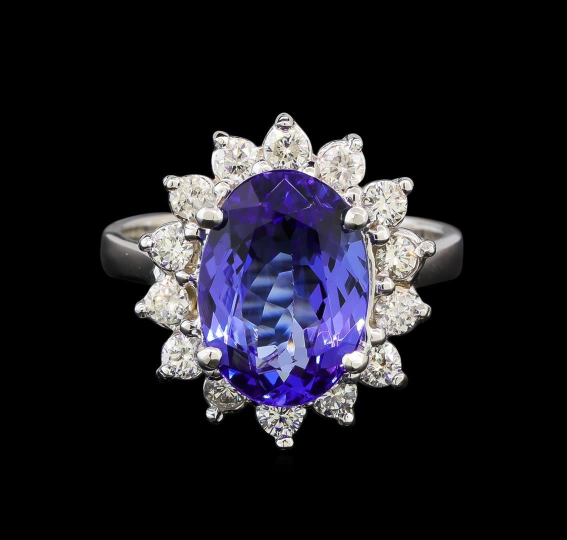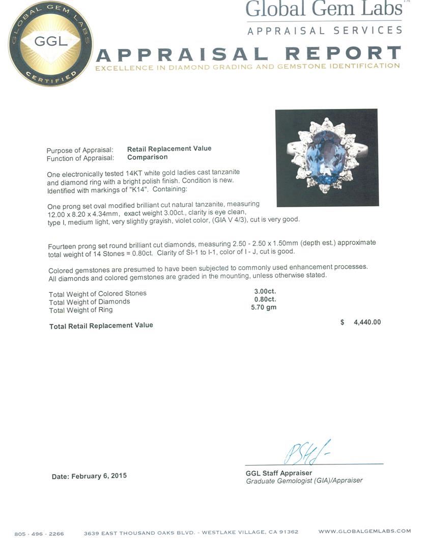 One electronically tested 14KT white gold ladies cast tanzanite and diamond ring with a bright polish finish. Identified with markings of "K14". Condition is new. Containing: One prong set oval modified brilliant cut natural tanzanite, measuring 12.00 x 8.20 x 4.34mm, exact weight 3.00ct., clarity is eye clean, type I, medium light, very slightly grayish, violet color, (GIA V 4/3), cut is very good. Fourteen prong set round brilliant cut diamonds, measuring 2.50 - 2.50 x 1.50mm (depth est.) approximate total weight of 14 Stones = 0.80ct. Clarity: SI-1 to I-1. Color: I - J, Cut is Good. Colored gemstones are presumed to have been subjected to commonly used enhancement processes. All diamonds and colored gemstones are graded in the mounting, unless otherwise stated. Total Weight of Colored Stones 3.00ct. Total Weight of Diamonds 0.80ct. Total Weight of Ring 5.70 grams. GGL Appraised at $4,440.00.