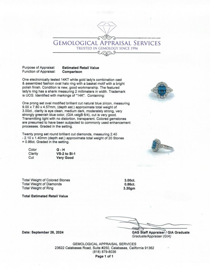 One electronically tested 14KT white gold lady's combination cast & assembled fashion oval halo ring with a basket motif with a bright polish finish. The featured lady's ring has a shank measuring 2 millimeters in width. Trademark is UCG. Identified with markings of "14K". Condition is new, good workmanship. Containing: One prong set oval modified brilliant cut natural blue zircon, measuring 9.00 x 7.80 x 4.57mm, (depth est.) approximate total weight of 3.00ct., clarity is eye clean, medium dark, moderately strong, very strongly greenish blue color, (GIA vstgB 6/4), cut is very good. Transmitting light with no distortion, transparent. Colored gemstones are presumed to have been subjected to commonly used enhancement processes. Graded in the setting. Twenty prong set round brilliant cut diamonds, measuring 2.40 - 2.10 x 1.40mm (depth est.) approximate total weight of 20 Stones = 0.86ct. Graded in the setting. Color: G - H. Clarity: VS-2 to SI-1. Cut: Very Good. Total Weight of Colored Stones: 3.00ct. Total Weight of Diamonds: 0.86ct. Total Weight of Ring: 3.30gm. Appraised by Gemological Appraisal Services. GAS Appraised.