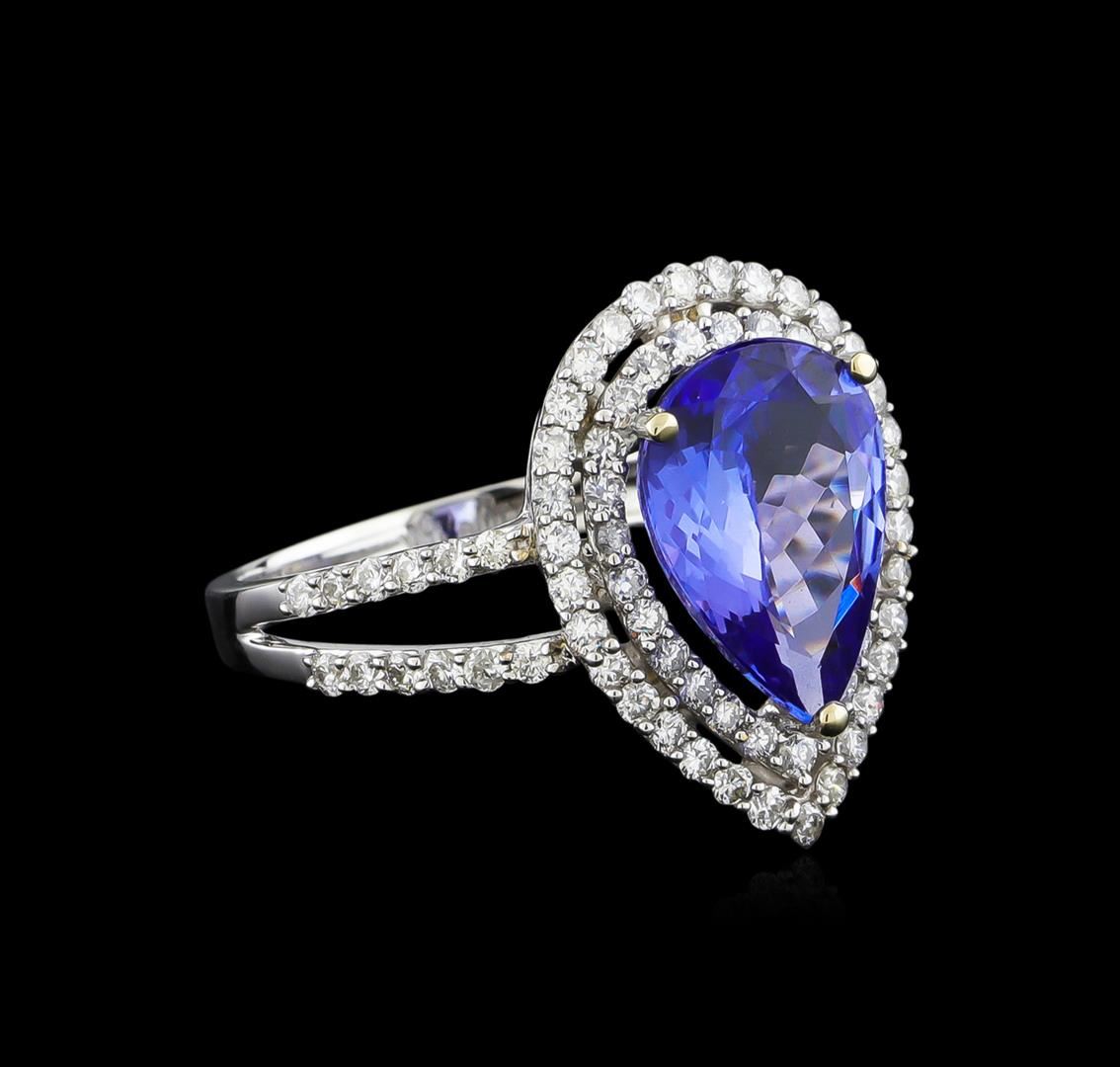 One electronically tested 14KT white gold ladies combination cast & assembled tanzanite and diamond ring with a split shank with a bright polish finish. Identified with markings of "14K". Condition is new. Containing: One prong set pear modified brilliant cut natural tanzanite, measuring 12.00 x 8.65 x 4.33mm, approximate weight of 3.01ct., clarity is eye clean, type I, medium, very slightly grayish, violet color, (GIA V 5/3), cut is good. Eighty-One prong set round brilliant cut diamonds, measuring 1.30 - 1.30 x 0.78mm (depth est.) approximate total weight of 81 Stones = 0.65ct. Clarity: I-1 to I-2. Color: I - J, Cut is Good. Colored gemstones are presumed to have been subjected to commonly used enhancement processes. All diamonds and colored gemstones are graded in the mounting, unless otherwise stated. Total Weight of Colored Stones 3.01ct. Total Weight of Diamonds 0.65ct. Total Weight of Ring 4.20 grams. GGL Appraised at $6,595.00.