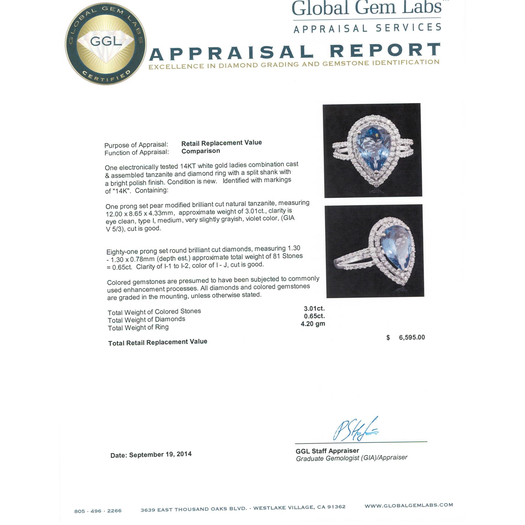 One electronically tested 14KT white gold ladies combination cast & assembled tanzanite and diamond ring with a split shank with a bright polish finish. Identified with markings of "14K". Condition is new. Containing: One prong set pear modified brilliant cut natural tanzanite, measuring 12.00 x 8.65 x 4.33mm, approximate weight of 3.01ct., clarity is eye clean, type I, medium, very slightly grayish, violet color, (GIA V 5/3), cut is good. Eighty-One prong set round brilliant cut diamonds, measuring 1.30 - 1.30 x 0.78mm (depth est.) approximate total weight of 81 Stones = 0.65ct. Clarity: I-1 to I-2. Color: I - J, Cut is Good. Colored gemstones are presumed to have been subjected to commonly used enhancement processes. All diamonds and colored gemstones are graded in the mounting, unless otherwise stated. Total Weight of Colored Stones 3.01ct. Total Weight of Diamonds 0.65ct. Total Weight of Ring 4.20 grams. GGL Appraised at $6,595.00.