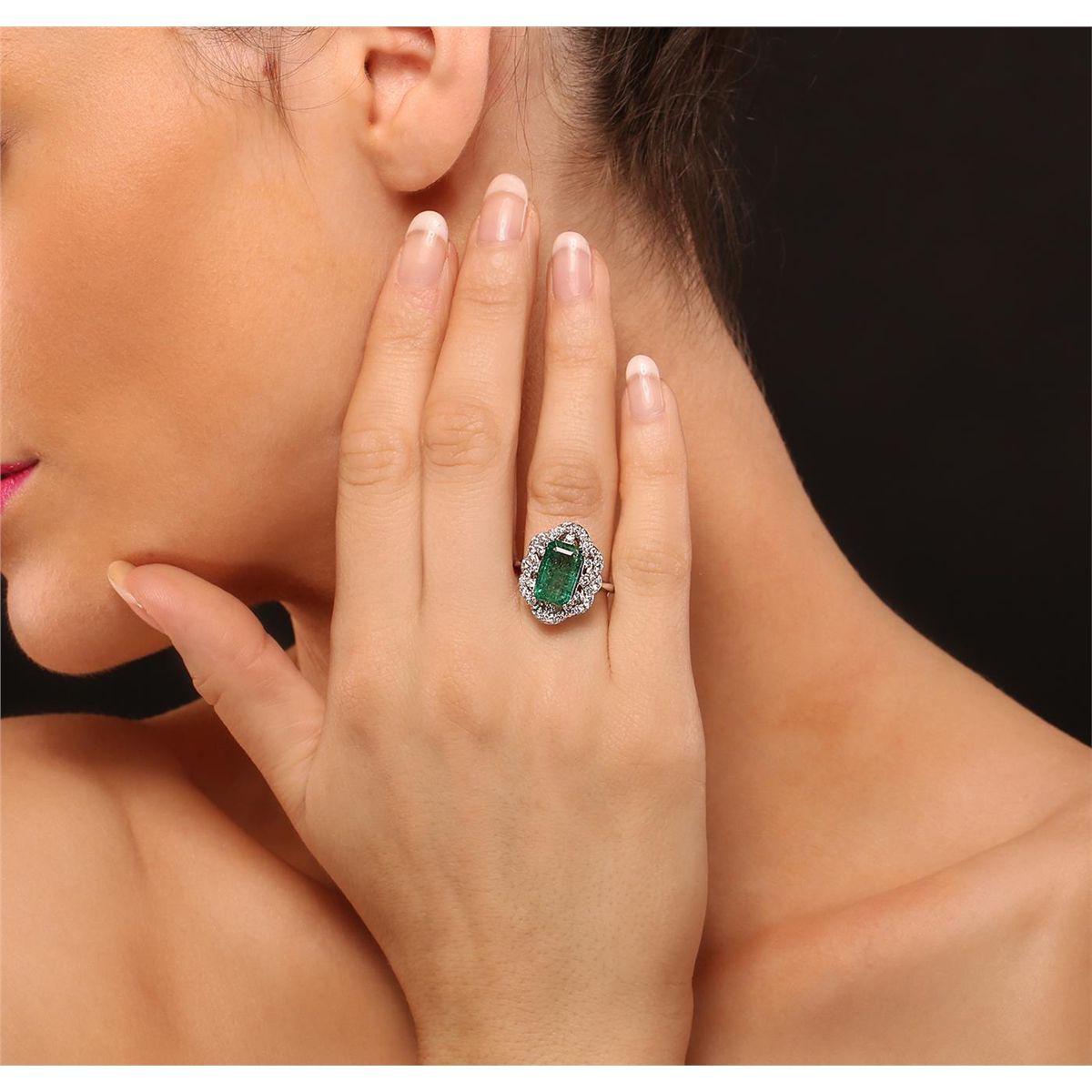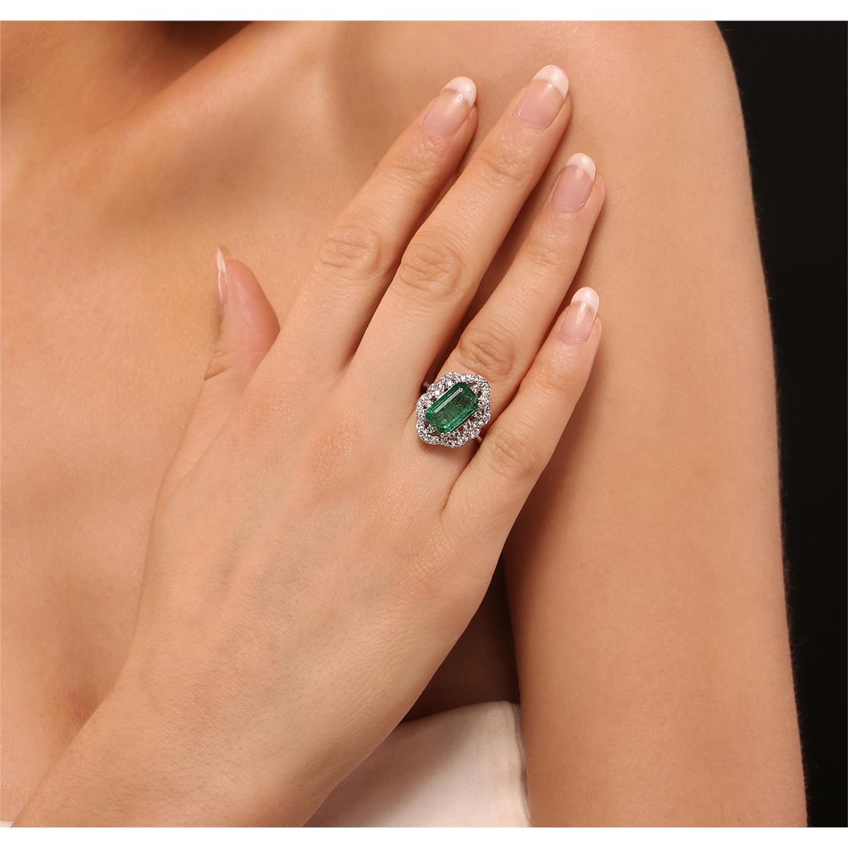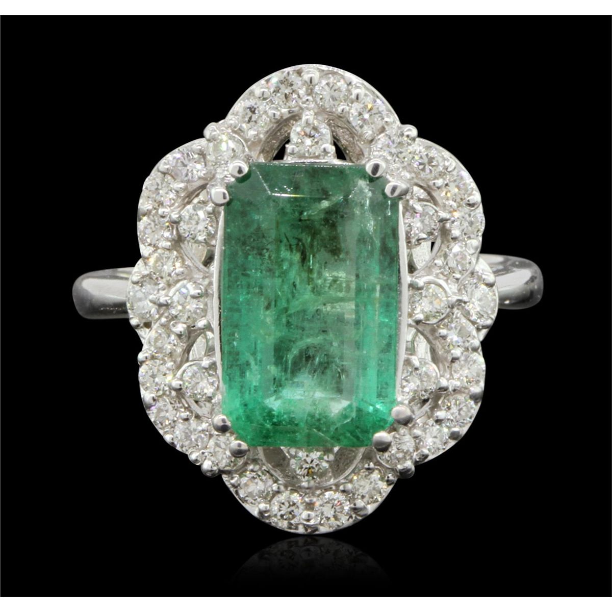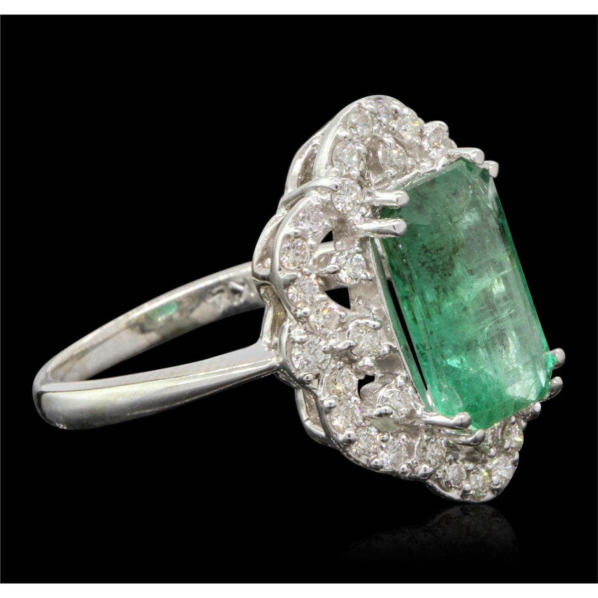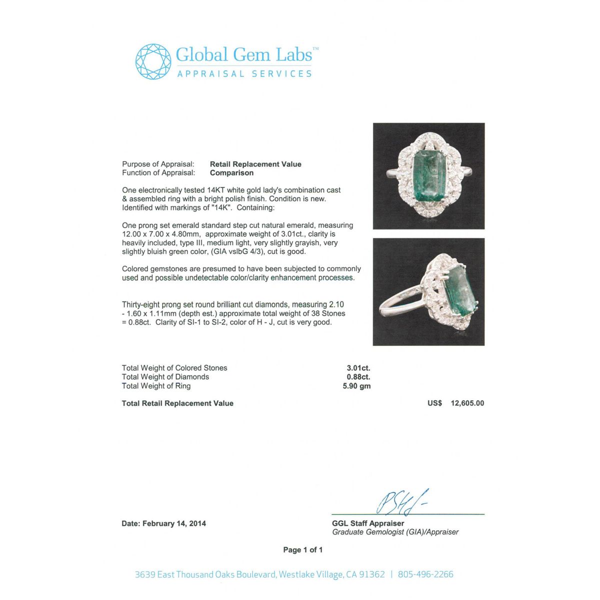 One electronically tested 14KT white gold Ladies combination cast & assembled ring with a bright polish finish. Condition is new. Identified with markings of "14K". Containing: One prong set emerald standard step cut natural emerald, measuring 12.00 x 7.00 x 4.80mm, approximate weight of 3.01ct., clarity is heavily included, type III, medium light, very slightly grayish, very slightly bluish green color, (GIA vslbG 4/3), cut is good. Colored gemstones are presumed to have been subjected to commonly used and possible undetectable color/clarity enhancement processes. Thirty-Eight prong set round brilliant cut diamonds, measuring 2.10 - 1.60 x 1.11mm (depth est.) approximate total weight of 38 Stones = 0.88ct. Clarity of SI-1 to SI-2, Color of H - J, Cut is Very Good. Total Weight of Colored Stones 3.01ct. Total Weight of Diamonds 0.88ct. Total Weight of Ring 5.90gm. GGL Appraised at $12,605.00.