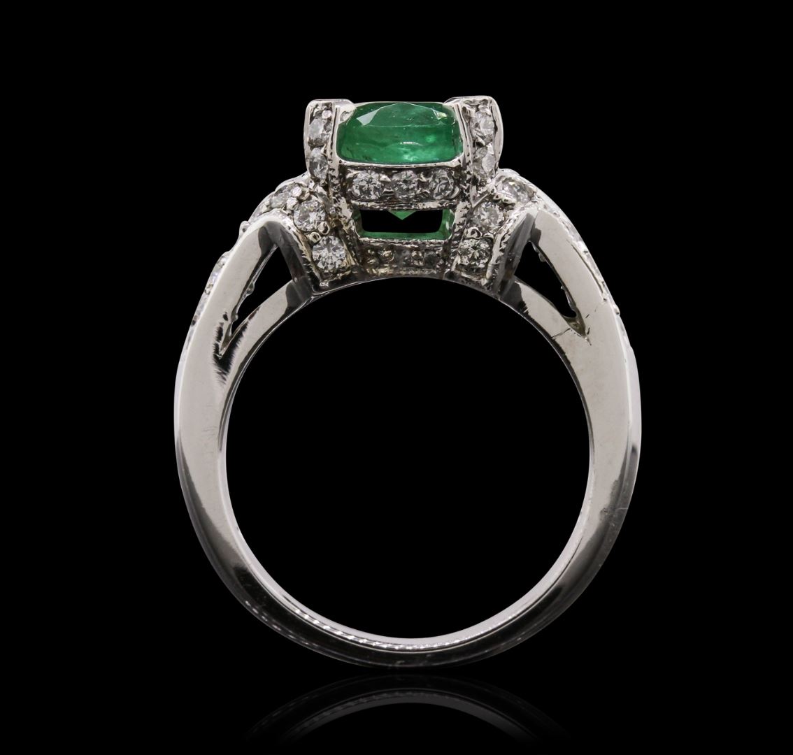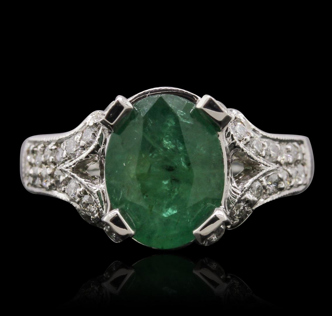 One electronically tested 14KT white gold ladies cast emerald and diamond ring with a bright and milgrain finish. Condition is new, good workmanship. The featured emerald is set within a diamond lattice gallery, supported by diamond set split shoulders and completed by a three millimeter wide band. Trademark is SA. Identified with markings of "14K". Containing: One prong set oval mixed cut natural emerald, measuring 10.85 x 8.60 x 5.55mm, approximate weight of 3.01ct., clarity is heavily included, type III, medium dark, very slightly grayish, very slightly bluish green color, (GIA vslbG 6/3), cut is good. Transmitting light somewhat diffusely, translucent. Naturally occurring internal & external characteristics are present. Indications of oil residue. Graded in the setting. Fifty-Two bead set round brilliant cut diamonds, measuring 1.70 - 0.90 x 0.78mm (depth est.) approximate. Total Weight of 52 Stones = 0.69ct. Graded in the setting. Clarity: SI-2 to I-2. Color: H - I. Total Weight of Colored Stones 3.01ct. Total Weight of Diamonds 0.69ct. Total Weight of Ring 7.70 grams. AIG Appraised at $5,400.00.