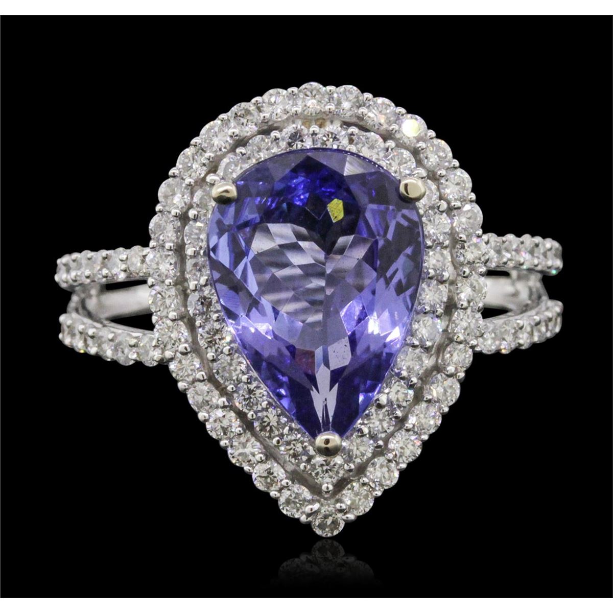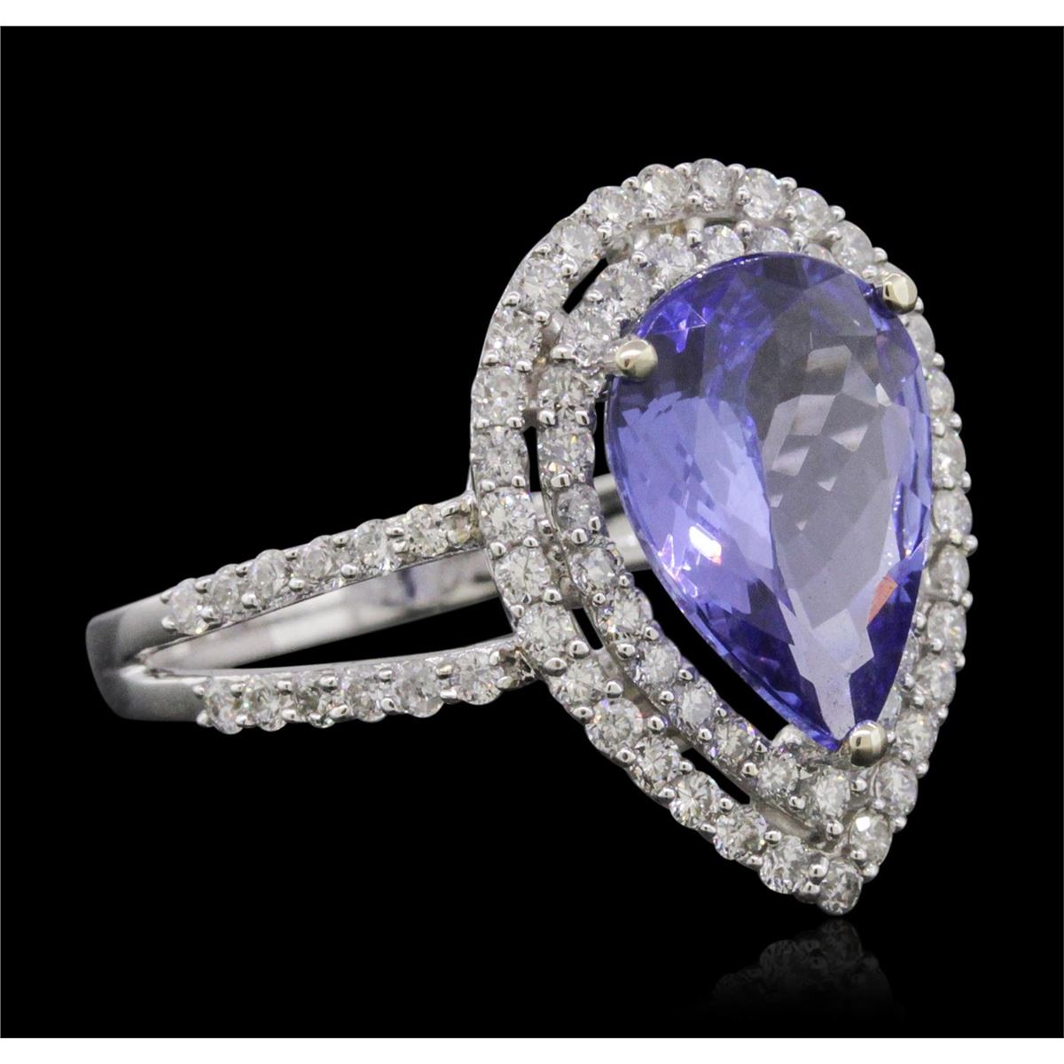 One electronically tested 14KT white gold ladies combination cast & assembled tanzanite and diamond ring with a split shank with a bright polish finish. Identified with markings of "14K". Condition is new. Containing: One prong set pear modified brilliant cut natural tanzanite, measuring 12.00 x 8.65 x 4.33mm, approximate weight of 3.01ct., clarity is eye clean, type I, medium, very slightly grayish, violet color, (GIA V 5/3), cut is good. Eighty-One prong set round brilliant cut diamonds, measuring 1.30 - 1.30 x 0.78mm (depth est.) approximate total weight of 81 Stones = 0.65ct. Clarity: I-1 to I-2. Color: I - J, Cut is Good. Colored gemstones are presumed to have been subjected to commonly used enhancement processes. All diamonds and colored gemstones are graded in the mounting, unless otherwise stated. Total Weight of Colored Stones 3.01ct. Total Weight of Diamonds 0.65ct. Total Weight of Ring 4.20 grams. GGL Appraised at $6,595.00.