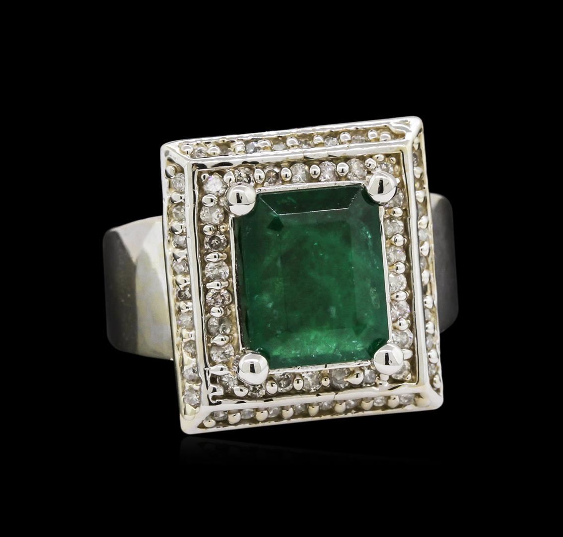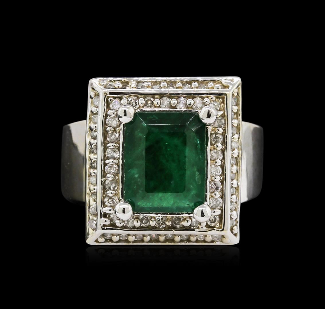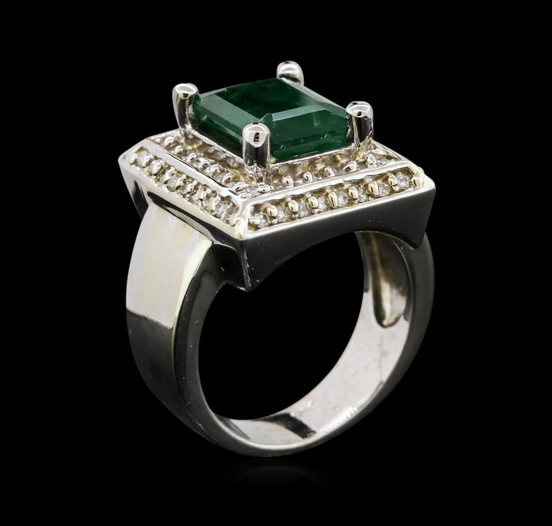 One polished, stamped, and electronically tested solid 14KT White Gold ring mounted with: 1 genuine emerald center stone weighing 3.02 carats and 60 genuine round full cut diamonds weighing 0.81 carats. This item weighs 11.6 grams, condition is new, good workmanship. AIGL Appraised at $4,400.00.