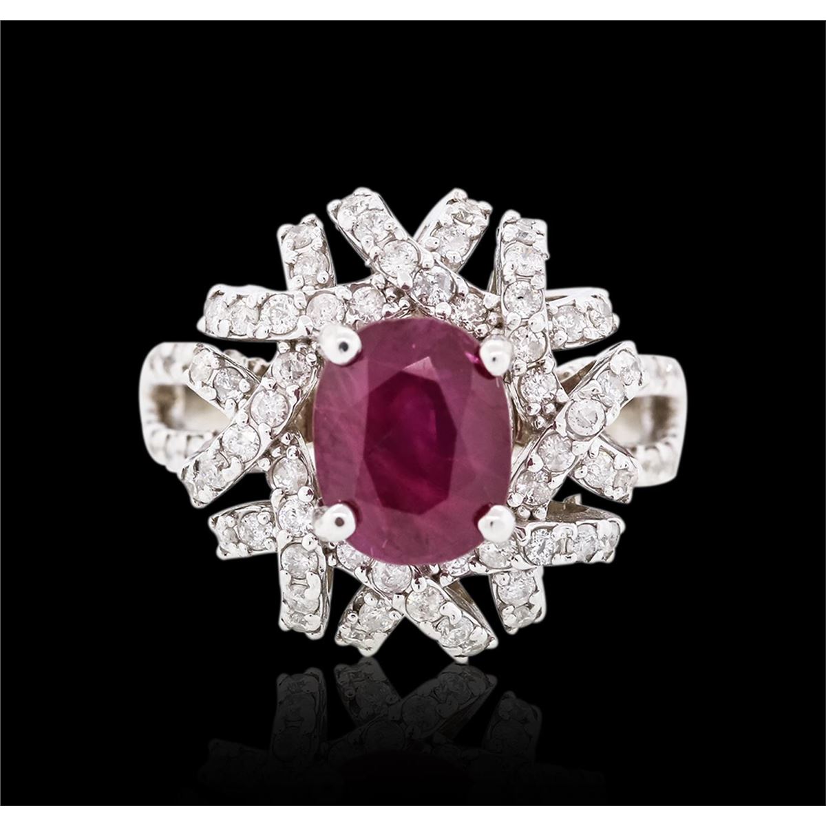 One electronically tested 14KT white gold ladies cast ruby and diamond ring with a bright polish finish. The featured ruby is set within intertwining diamond ribbons supported by diamond set split shoulders, completed by a three millimeter wide band. Identified with markings of "14K". Condition is new, good workmanship. Containing: One prong set oval mixed cut natural ruby, measuring 8.80 x 7.00 x 5.60mm, 8% bulge factor, approximate weight of 3.02ct., clarity is heavily included, type II, dark, very slightly brownish, red color, (GIA R 7/3), cut is good. Transmitting light somewhat diffusely, transparent to translucent. Naturally occurring internal& external characteristics are present. Indications of laboratory high temperature heat treatment, with flux additives. Graded in the setting. Ruby has a low tolerance to rhodium plating, repolishing the surface, & ultrasonic cleaning. One Hundred Twelve prong set round brilliant cut diamonds, measuring 1.50 - 1.40 x 0.87mm (depth est.) approximate total weight of 112 Stones = 1.34ct. Graded in the setting. Clarity I-1 to I-2. Color G - I. Total Weight of Colored Stones 3.02ct. Total Weight of Diamonds 1.34ct. Total Weight of Ring 8.35 grams. AIG Appraised at $5,660.00.