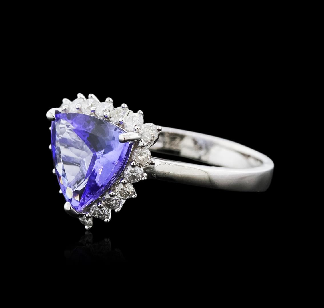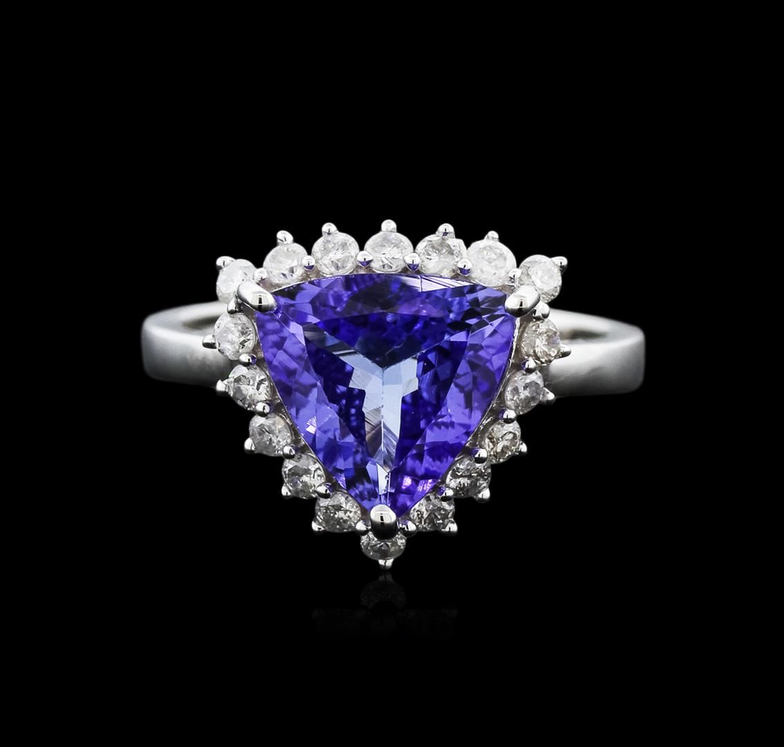 One electronically tested 14KT white gold ladies cast tanzanite and diamond ring with a flat shank with a bright polish finish. Trademark is Orianne. Identified with markings of "14K". Condition is new. Containing: One prong set triangle modified brilliant cut natural tanzanite, measuring 10.00 x 10.00 x 5.01mm, approximate weight of 3.02ct., clarity is eye clean, type I, medium, very slightly grayish, violet color, (GIA V 5/3), cut is good. Eighteen prong set round brilliant cut diamonds, measuring 1.70 - 1.70 x 1.02mm (depth est.) approximate total weight of 18 Stones = 0.32ct. Clarity: SI-2 to I-2. Color: I - J. All diamonds and colored gemstones are graded in the mounting, unless otherwise stated. Colored gemstones are presumed to have been subjected to commonly used enhancement processes. Total Weight of Colored Stones 3.02ct. Total Weight of Diamonds 0.32ct. Total Weight of Ring 3.30 grams. GGL Appraised at $3,270.00.