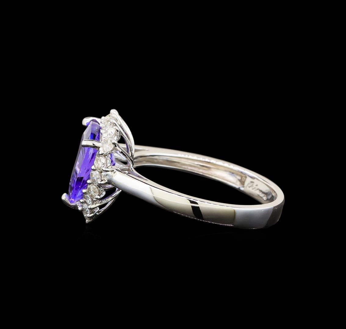 One electronically tested 14KT white gold ladies cast tanzanite and diamond ring with a flat shank with a bright polish finish. Trademark is Orianne. Identified with markings of "14K". Condition is new. Containing: One prong set triangle modified brilliant cut natural tanzanite, measuring 10.00 x 10.00 x 5.01mm, approximate weight of 3.02ct., clarity is eye clean, type I, medium, very slightly grayish, violet color, (GIA V 5/3), cut is good. Eighteen prong set round brilliant cut diamonds, measuring 1.70 - 1.70 x 1.02mm (depth est.) approximate total weight of 18 Stones = 0.32ct. Clarity: SI-2 to I-2. Color: I - J. All diamonds and colored gemstones are graded in the mounting, unless otherwise stated. Colored gemstones are presumed to have been subjected to commonly used enhancement processes. Total Weight of Colored Stones 3.02ct. Total Weight of Diamonds 0.32ct. Total Weight of Ring 3.30 grams. GGL Appraised at $3,270.00.