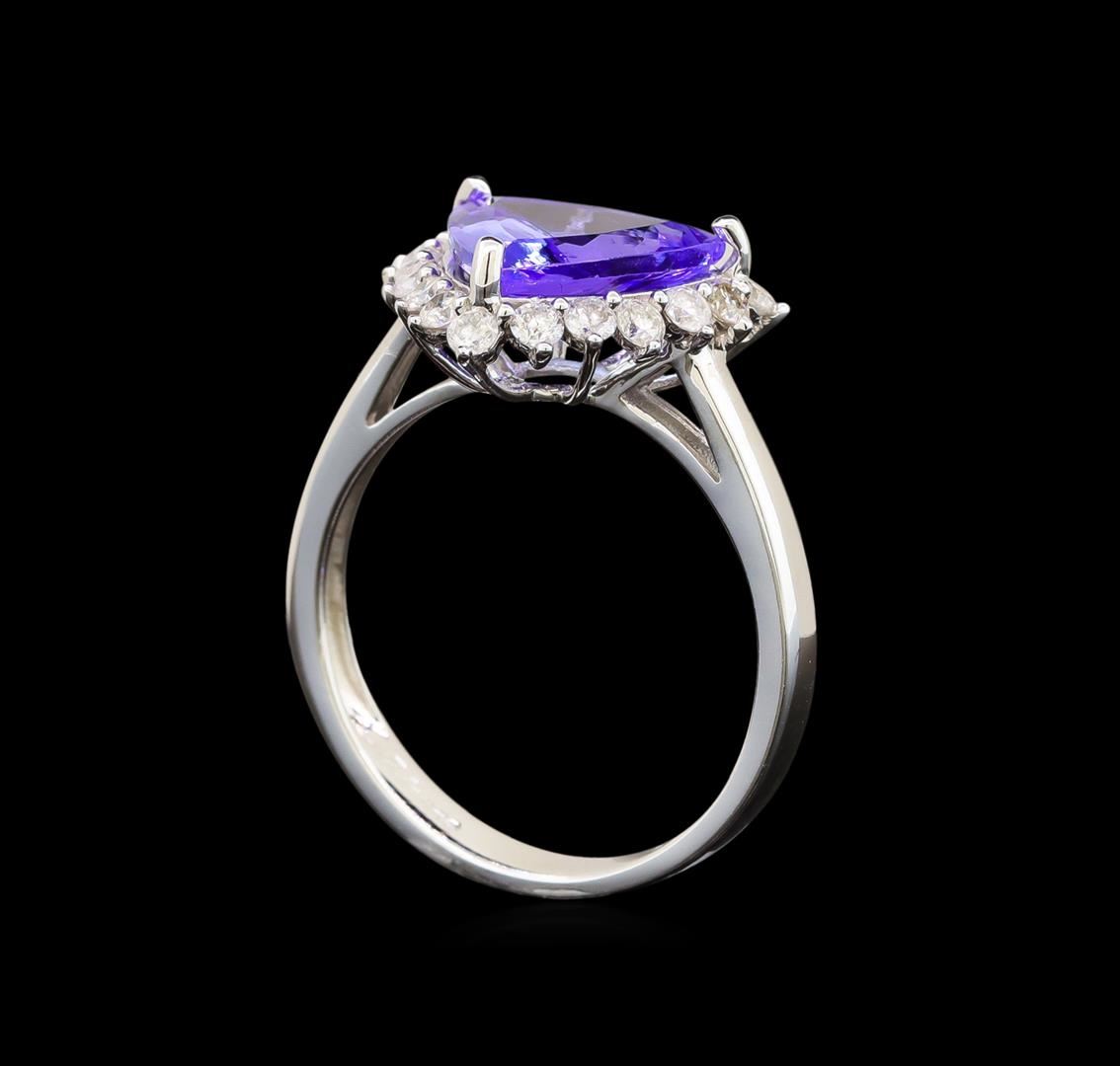 One electronically tested 14KT white gold ladies cast tanzanite and diamond ring with a flat shank with a bright polish finish. Trademark is Orianne. Identified with markings of "14K". Condition is new. Containing: One prong set triangle modified brilliant cut natural tanzanite, measuring 10.00 x 10.00 x 5.01mm, approximate weight of 3.02ct., clarity is eye clean, type I, medium, very slightly grayish, violet color, (GIA V 5/3), cut is good. Eighteen prong set round brilliant cut diamonds, measuring 1.70 - 1.70 x 1.02mm (depth est.) approximate total weight of 18 Stones = 0.32ct. Clarity: SI-2 to I-2. Color: I - J. All diamonds and colored gemstones are graded in the mounting, unless otherwise stated. Colored gemstones are presumed to have been subjected to commonly used enhancement processes. Total Weight of Colored Stones 3.02ct. Total Weight of Diamonds 0.32ct. Total Weight of Ring 3.30 grams. GGL Appraised at $3,270.00.