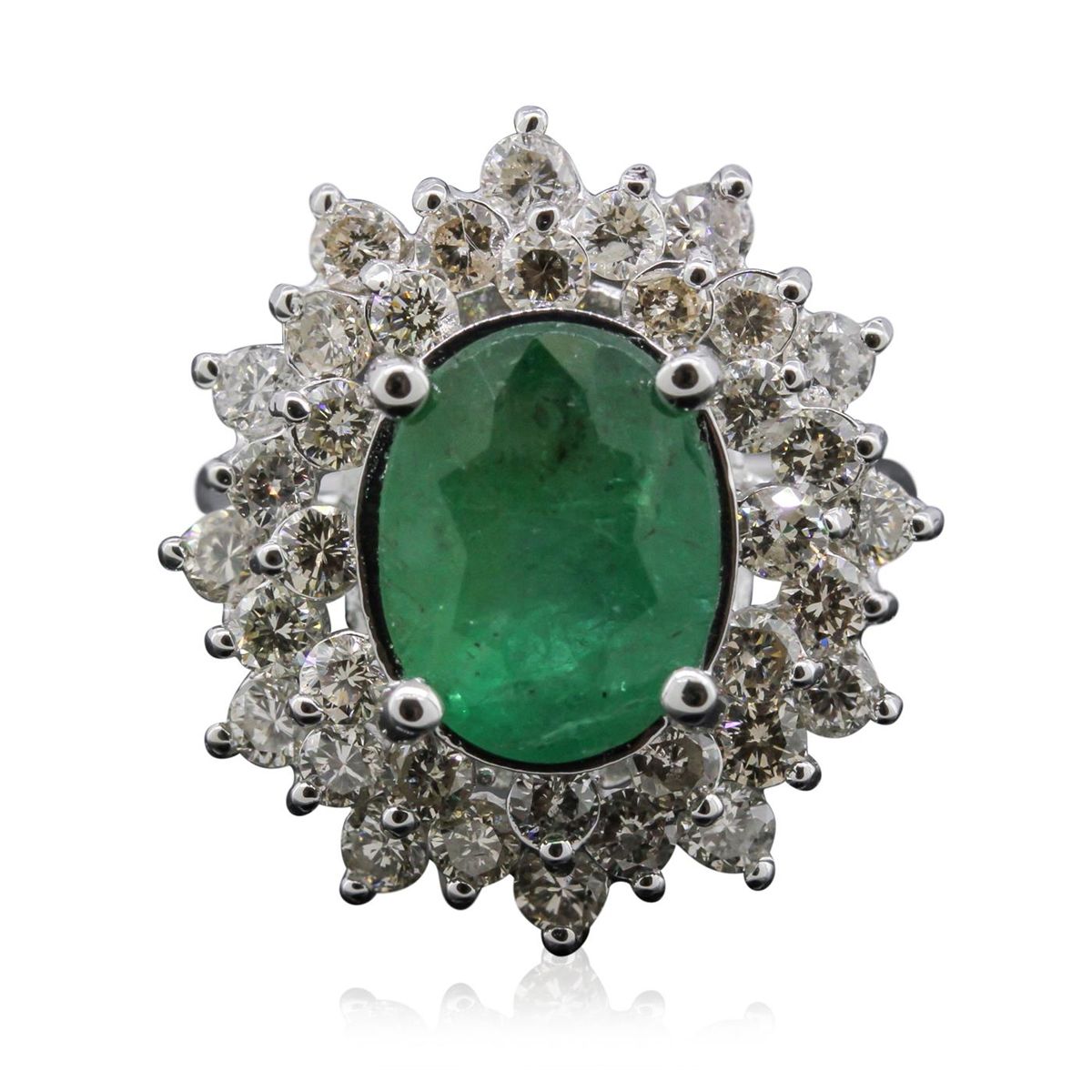 One electronically tested 14KT white gold Ladies combination cast & assembled fancy ring with a high polish finish. Condition is new. Identified with markings of "14K". Containing: One prong set oval modified brilliant cut natural emerald, measuring 11.30 x 8.80 x 5.50mm, approximate weight of 3.02ct., clarity is heavily included, type III, medium dark, moderately strong, green color, (GIA G 6/4), cut is good. Colored gemstones are presumed to have been subjected to commonly used and possible undetectable color/clarity enhancement processes. Thirty-Six prong set round brilliant cut diamonds, measuring 2.50 - 2.00 x 1.49mm (depth est.) approximate total weight of 36 Stones = 1.88ct. Clarity of SI-2 to I-2, Color of J - K, Cut is Good. Total Weight of Colored Stones 3.02ct. Total Weight of Diamonds 1.88ct. Total Weight of Ring 7.90 grams. GGL Appraised at $11,640.00.