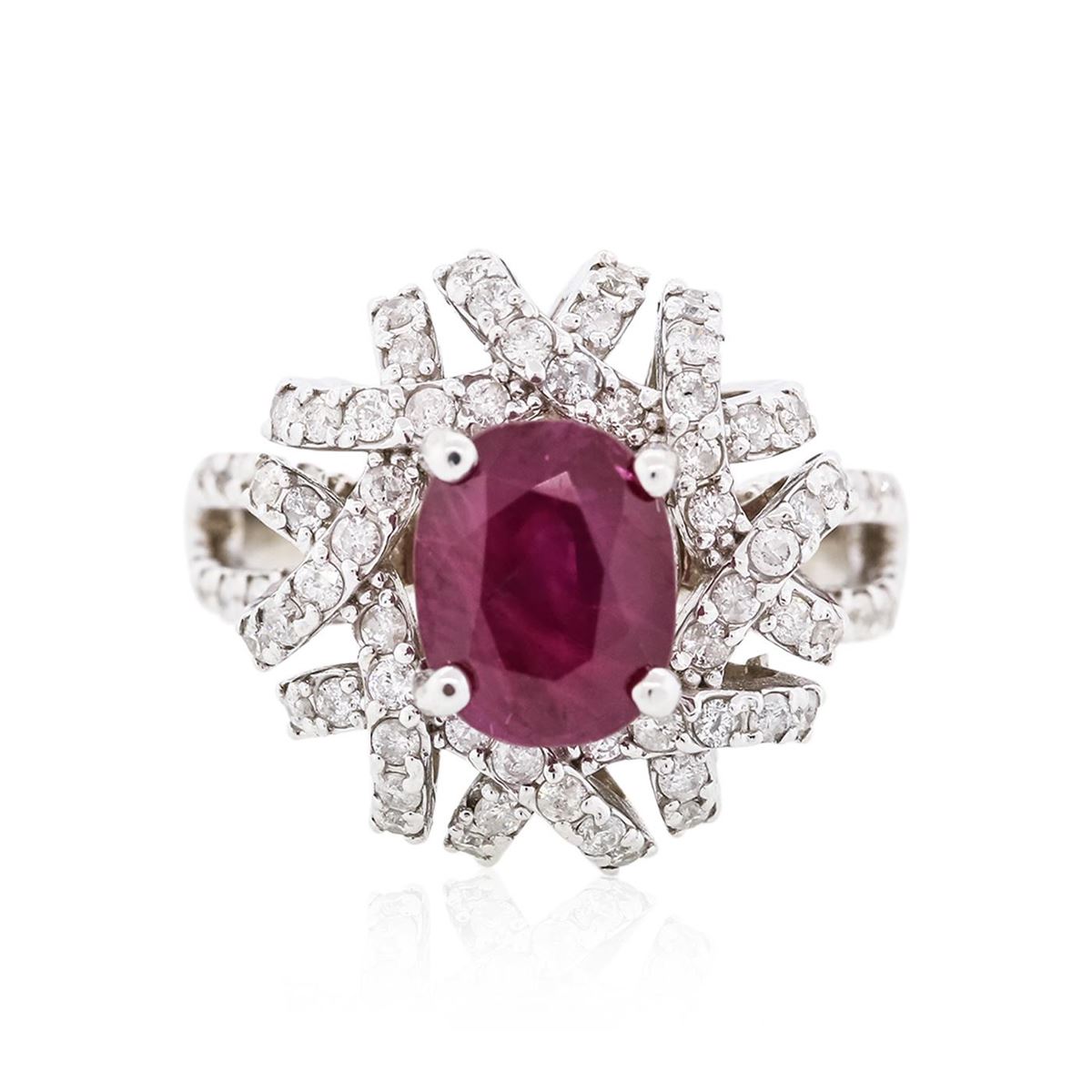 One electronically tested 14KT white gold ladies cast ruby and diamond ring with a bright polish finish. The featured ruby is set within intertwining diamond ribbons supported by diamond set split shoulders, completed by a three millimeter wide band. Identified with markings of "14K". Condition is new, good workmanship. Containing: One prong set oval mixed cut natural ruby, measuring 8.80 x 7.00 x 5.60mm, 8% bulge factor, approximate weight of 3.02ct., clarity is heavily included, type II, dark, very slightly brownish, red color, (GIA R 7/3), cut is good. Transmitting light somewhat diffusely, transparent to translucent. Naturally occurring internal& external characteristics are present. Indications of laboratory high temperature heat treatment, with flux additives. Graded in the setting. Ruby has a low tolerance to rhodium plating, repolishing the surface, & ultrasonic cleaning. One Hundred Twelve prong set round brilliant cut diamonds, measuring 1.50 - 1.40 x 0.87mm (depth est.) approximate total weight of 112 Stones = 1.34ct. Graded in the setting. Clarity I-1 to I-2. Color G - I. Total Weight of Colored Stones 3.02ct. Total Weight of Diamonds 1.34ct. Total Weight of Ring 8.35 grams. AIG Appraised at $5,660.00.