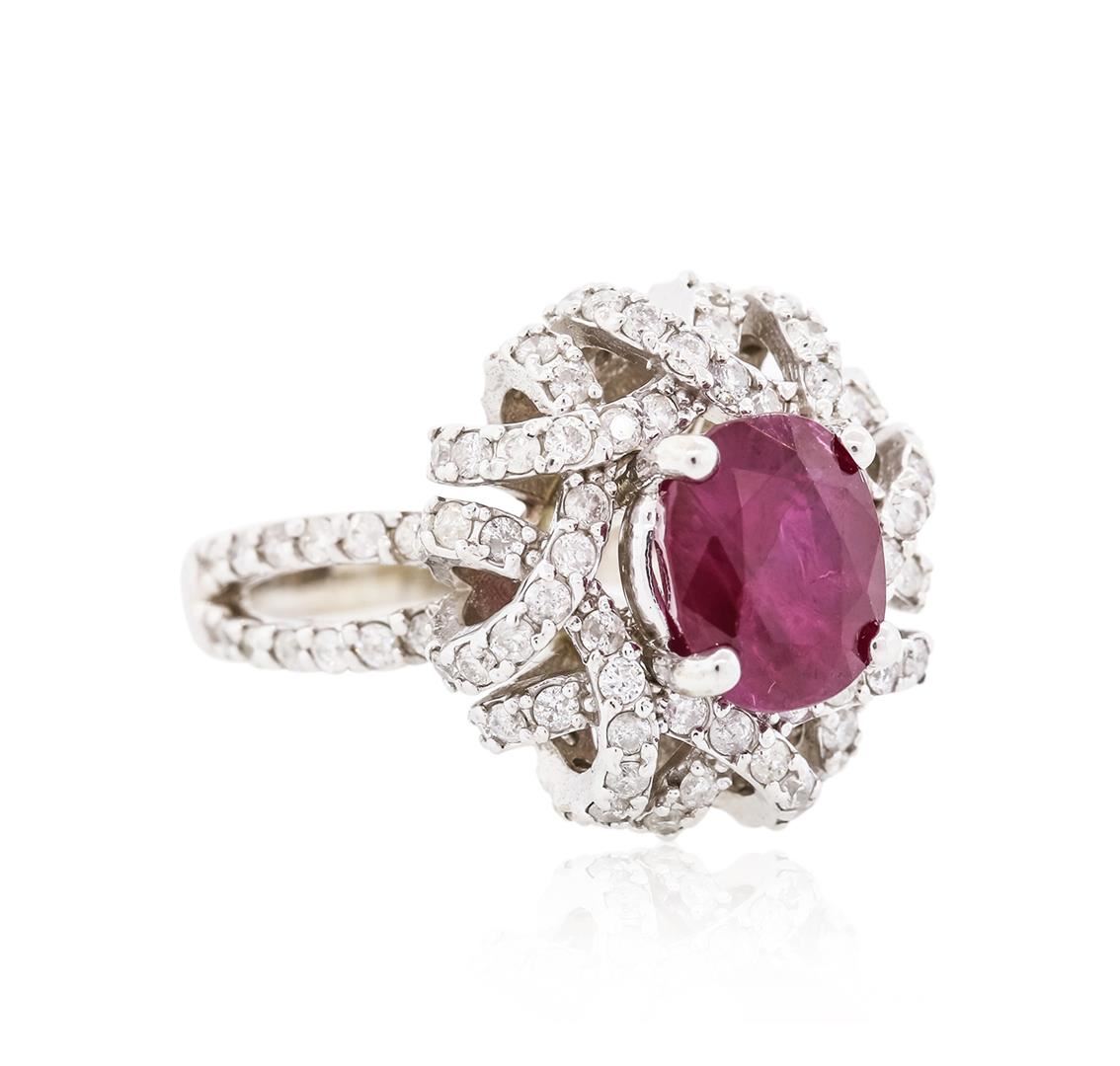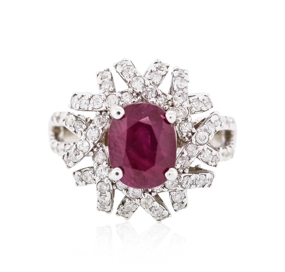 One electronically tested 14KT white gold ladies cast ruby and diamond ring with a bright polish finish. The featured ruby is set within intertwining diamond ribbons supported by diamond set split shoulders, completed by a three millimeter wide band. Identified with markings of "14K". Condition is new, good workmanship. Containing: One prong set oval mixed cut natural ruby, measuring 8.80 x 7.00 x 5.60mm, 8% bulge factor, approximate weight of 3.02ct., clarity is heavily included, type II, dark, very slightly brownish, red color, (GIA R 7/3), cut is good. Transmitting light somewhat diffusely, transparent to translucent. Naturally occurring internal& external characteristics are present. Indications of laboratory high temperature heat treatment, with flux additives. Graded in the setting. Ruby has a low tolerance to rhodium plating, repolishing the surface, & ultrasonic cleaning. One Hundred Twelve prong set round brilliant cut diamonds, measuring 1.50 - 1.40 x 0.87mm (depth est.) approximate total weight of 112 Stones = 1.34ct. Graded in the setting. Clarity I-1 to I-2. Color G -- I. Total Weight of Colored Stones 3.02ct. Total Weight of Diamonds 1.34ct. Total Weight of Ring 8.35 grams. AIG Appraised at $5,660.00.