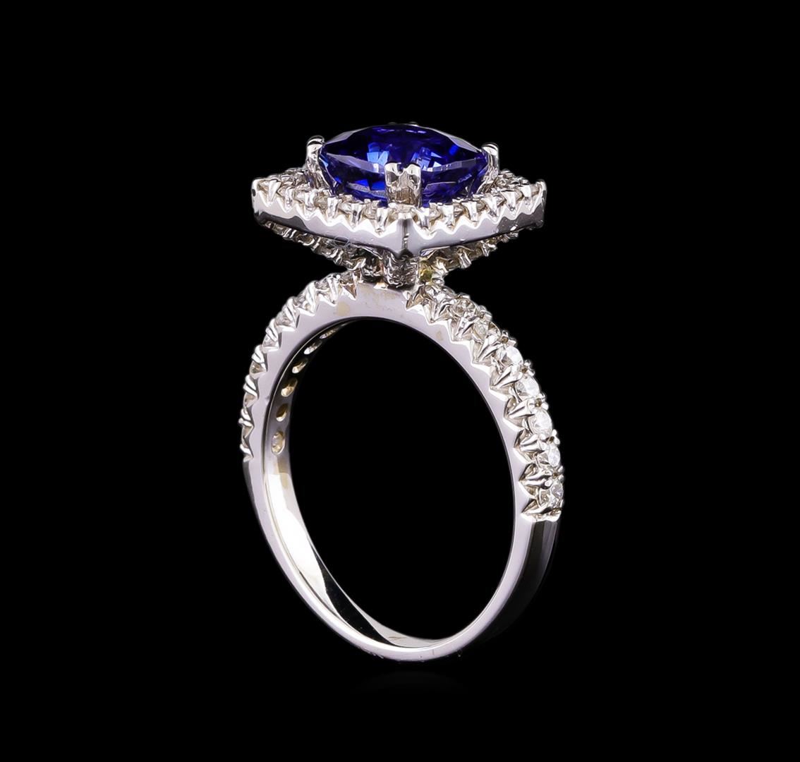 One electronically tested 14KT white gold ladies combination cast & assembled sapphire and diamond ring with a flat shank with a bright polish finish. Identified with markings of "K14". Condition is new. Containing: One prong set square cushion modified brilliant cut natural blue sapphire, measuring 7.95 x 7.88 x 5.15mm, approximate weight of 3.03ct., clarity is eye clean, type II, medium, moderately strong, blue color, (GIA B 5/4), cut is good. Fifty-Six prong set round brilliant cut diamonds, measuring 1.60 - 1.10 x 0.81mm (depth est.) approximate total weight of 56 Stones = 0.50ct. Clarity: SI-1 to SI-2. Color: I - J, Cut is Good. Colored gemstones are presumed to have been subjected to commonly used enhancement processes. All diamonds and colored gemstones are graded in the mounting, unless otherwise stated. Total Weight of Colored Stones 3.03ct. Total Weight of Diamonds 0.50ct. Total Weight of Ring 5.70 grams. GGL Appraised.