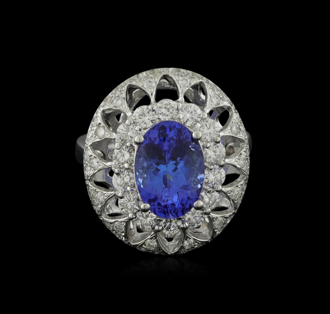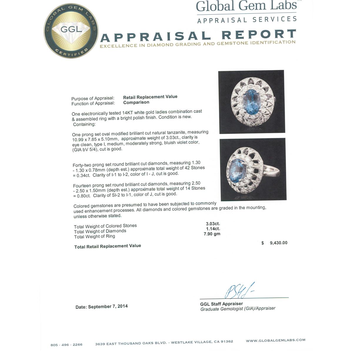 One electronically tested 14KT white gold ladies combination cast & assembled ring with a bright polish finish. Condition is new. Containing: One prong set oval modified brilliant cut natural tanzanite, measuring 10.99 x 7.85 x 5.10mm, approximate weight of 3.03ct., clarity is eye clean, type I, medium, moderately strong, bluish violet color, (GIA bV 5/4), cut is good. Forty-Two prong set round brilliant cut diamonds, measuring 1.30 - 1.30 x 0.78mm (depth est.) approximate total weight of 42 Stones = 0.34ct. Clarity: I-1 to I-2. Color: I - J, Cut is Good. Fourteen prong set round brilliant cut diamonds, measuring 2.50 - 2.50 x 1.50mm (depth est.) approximate total weight of 14 Stones = 0.80ct. Clarity: SI-2 to I-1. Color: J, Cut is Good. Colored gemstones are presumed to have been subjected to commonly used enhancement processes. All diamonds and colored gemstones are graded in the mounting, unless otherwise stated. Total Weight of Colored Stones 3.03ct. Total Weight of Diamonds 1.14ct. Total Weight of Ring 7.90 grams. GGL Appraised at $9,430.00.