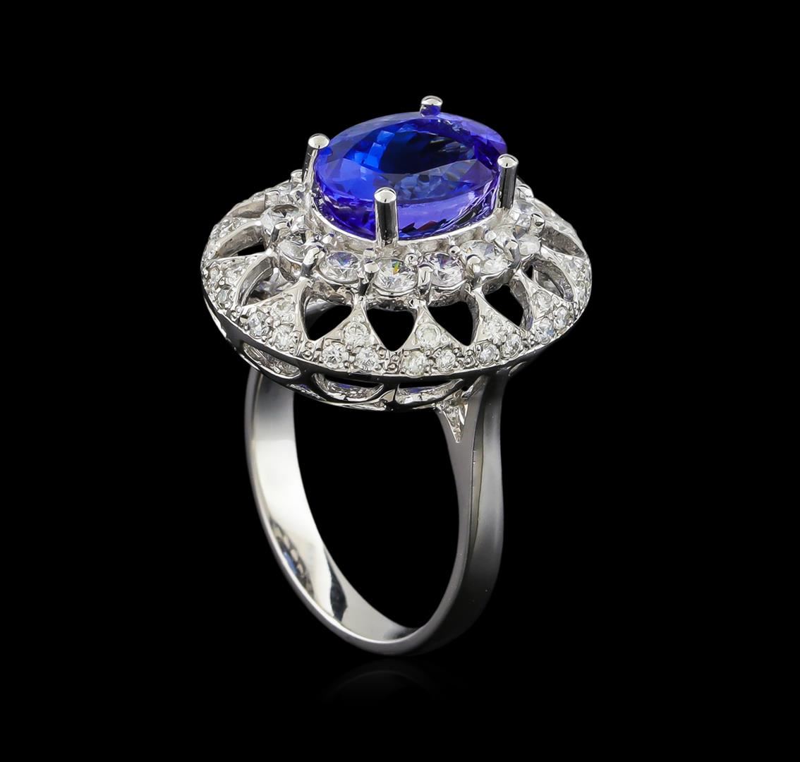 One electronically tested 14KT white gold ladies combination cast & assembled ring with a bright polish finish. Condition is new. Containing: One prong set oval modified brilliant cut natural tanzanite, measuring 10.99 x 7.85 x 5.10mm, approximate weight of 3.03ct., clarity is eye clean, type I, medium, moderately strong, bluish violet color, (GIA bV 5/4), cut is good. Forty-Two prong set round brilliant cut diamonds, measuring 1.30 - 1.30 x 0.78mm (depth est.) approximate total weight of 42 Stones = 0.34ct. Clarity: I-1 to I-2. Color: I - J, Cut is Good. Fourteen prong set round brilliant cut diamonds, measuring 2.50 - 2.50 x 1.50mm (depth est.) approximate total weight of 14 Stones = 0.80ct. Clarity: SI-2 to I-1. Color: J, Cut is Good. Colored gemstones are presumed to have been subjected to commonly used enhancement processes. All diamonds and colored gemstones are graded in the mounting, unless otherwise stated. Total Weight of Colored Stones 3.03ct. Total Weight of Diamonds 1.14ct. Total Weight of Ring 7.90 grams. GGL Appraised at $9,430.00.