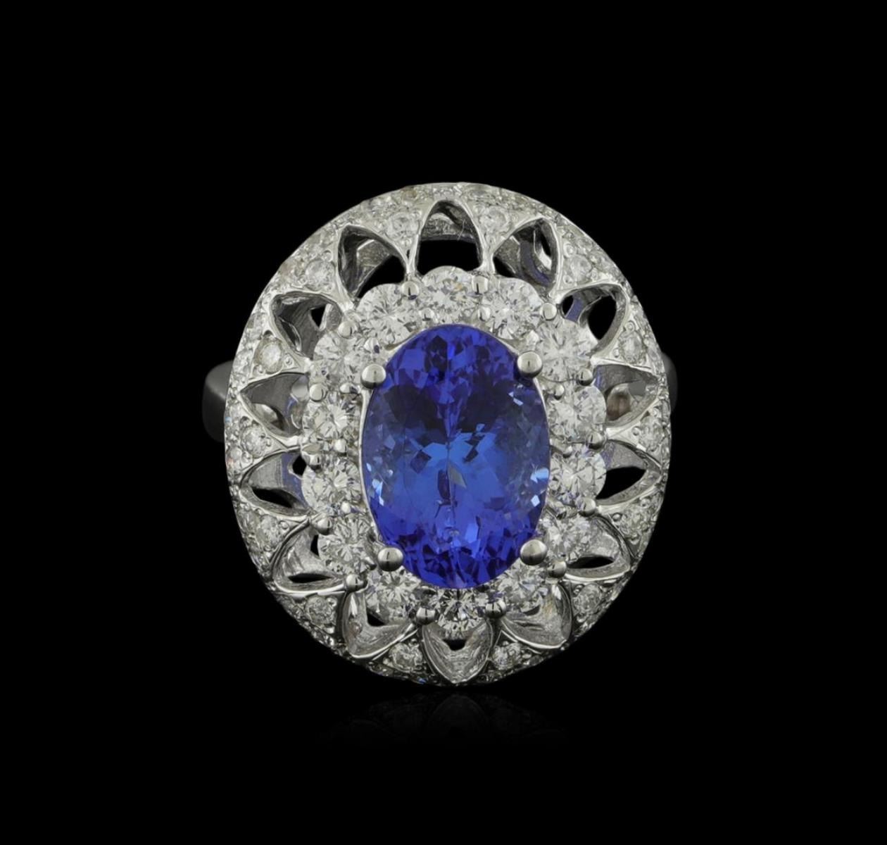 One electronically tested 14KT white gold ladies combination cast & assembled ring with a bright polish finish. Condition is new. Containing: One prong set oval modified brilliant cut natural tanzanite, measuring 10.99 x 7.85 x 5.10mm, approximate weight of 3.03ct., clarity is eye clean, type I, medium, moderately strong, bluish violet color, (GIA bV 5/4), cut is good. Forty-Two prong set round brilliant cut diamonds, measuring 1.30 - 1.30 x 0.78mm (depth est.) approximate total weight of 42 Stones = 0.34ct. Clarity: I-1 to I-2. Color: I - J, Cut is Good. Fourteen prong set round brilliant cut diamonds, measuring 2.50 - 2.50 x 1.50mm (depth est.) approximate total weight of 14 Stones = 0.80ct. Clarity: SI-2 to I-1. Color: J, Cut is Good. Colored gemstones are presumed to have been subjected to commonly used enhancement processes. All diamonds and colored gemstones are graded in the mounting, unless otherwise stated. Total Weight of Colored Stones 3.03ct. Total Weight of Diamonds 1.14ct. Total Weight of Ring 7.90 grams. GGL Appraised.