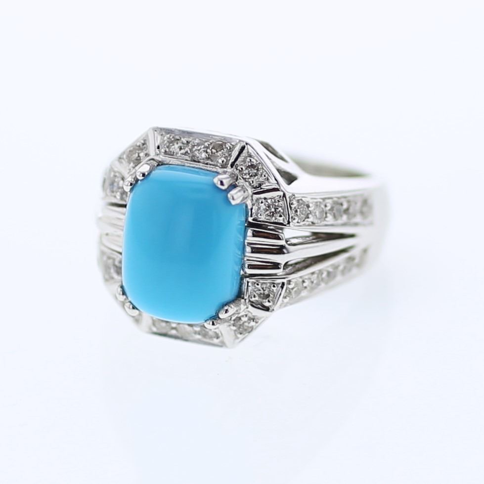 One 14KT White Gold 3.03ct Turquoise and Diamond Ring. (1) Turquoise stone with a total weight of 3.03cts. (34) Diamonds with a total weight of 0.63cts. Total weight of this ring is 11.36 grams. Total weight of this ring is 11.36 grams.