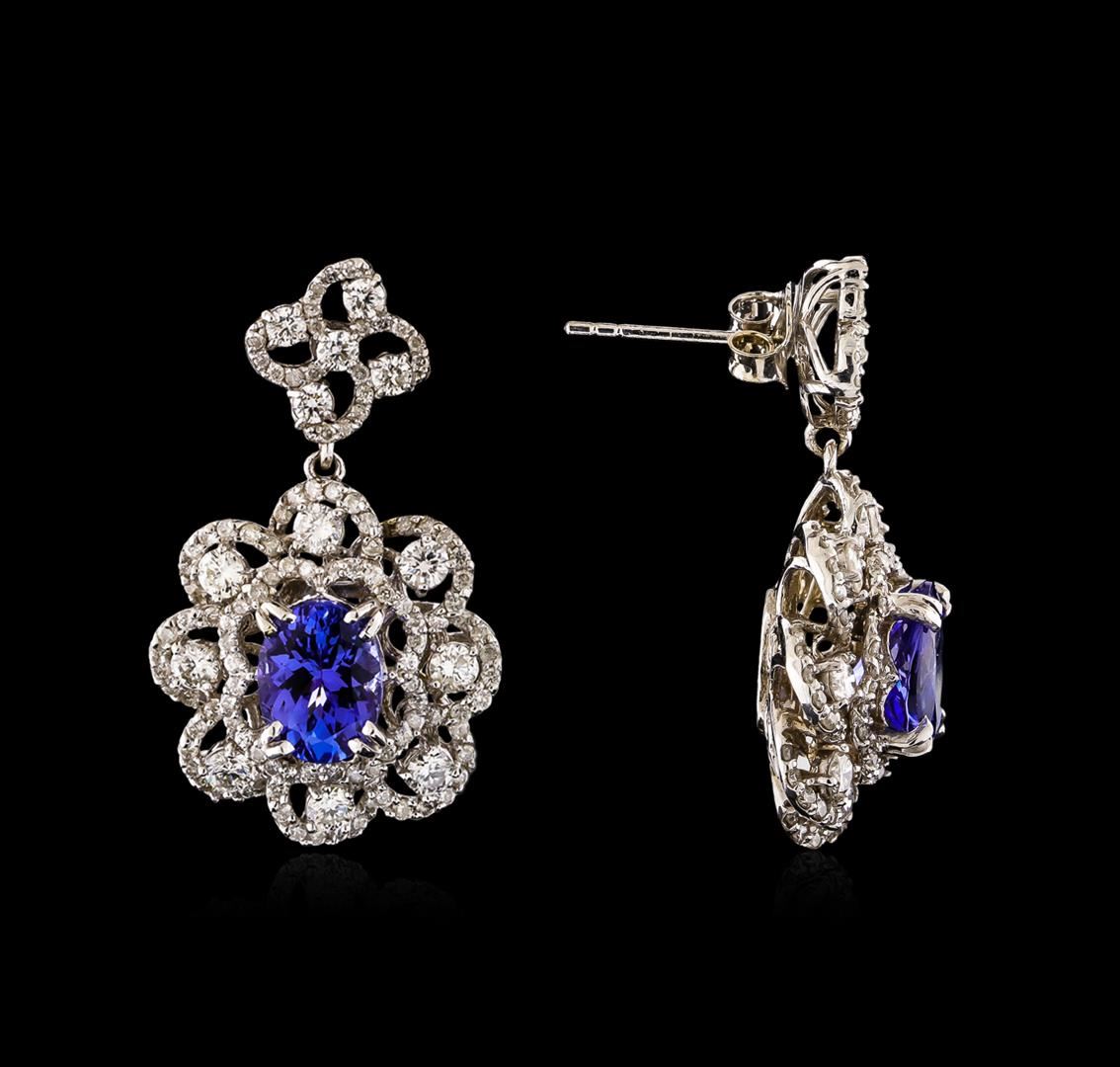 One pair electronically tested 14KT white gold ladies combination cast & assembled dangle earrings with hinged clip backs with a bright polish finish. Condition is new. Identified with markings of "K14". Containing: Two prong set oval modified brilliant cut natural tanzanites, measuring 8.80 x 6.20 x 4.03mm, approximate. Total Weight of 3.04ct., clarity is eye clean, type I, medium light, very slightly grayish, bluish violet color, (GIA bV 4/3), cut is good. Sixteen prong set round brilliant cut diamonds, measuring 2.50 - 2.50 x 1.50mm (depth est.) approximate. Total Weight of 16 Stones = 0.91ct. Clarity: SI-1 to SI-2. Color: I - J, Cut is Good. Ten prong set round brilliant cut diamonds, measuring 2.20 - 2.20 x 1.32mm (depth est.) approximate. Total Weight of 10 Stones = 0.39ct. Clarity: SI-1 to SI-2. Color: H - I, Cut is Good. Two Hundred Sixteen prong set round brilliant cut diamonds, measuring 1.00 - 1.00 x 0.60mm (depth est.) approximate. Total Weight of 216 Stones = 0.78ct. Clarity: I-1 to I-2. Color: I - J, Cut is Good. Colored gemstones are presumed to have been subjected to commonly used enhancement processes. All diamonds and colored gemstones are graded in the mounting, unless otherwise stated. Total Weight of Colored Stones 3.04ct. Total Weight of Diamonds 2.08ct. Total Weight of Earrings 9.80 grams. GGL Appraised at $12,710.00.