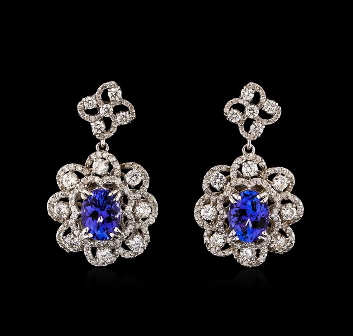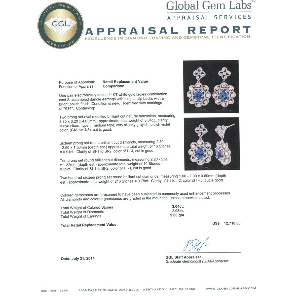 One pair electronically tested 14KT white gold ladies combination cast & assembled dangle earrings with hinged clip backs with a bright polish finish. Condition is new. Identified with markings of "K14". Containing: Two prong set oval modified brilliant cut natural tanzanites, measuring 8.80 x 6.20 x 4.03mm, approximate. Total Weight of 3.04ct., clarity is eye clean, type I, medium light, very slightly grayish, bluish violet color, (GIA bV 4/3), cut is good. Sixteen prong set round brilliant cut diamonds, measuring 2.50 - 2.50 x 1.50mm (depth est.) approximate. Total Weight of 16 Stones = 0.91ct. Clarity: SI-1 to SI-2. Color: I - J, Cut is Good. Ten prong set round brilliant cut diamonds, measuring 2.20 - 2.20 x 1.32mm (depth est.) approximate. Total Weight of 10 Stones = 0.39ct. Clarity: SI-1 to SI-2. Color: H - I, Cut is Good. Two Hundred Sixteen prong set round brilliant cut diamonds, measuring 1.00 - 1.00 x 0.60mm (depth est.) approximate. Total Weight of 216 Stones = 0.78ct. Clarity: I-1 to I-2. Color: I - J, Cut is Good. Colored gemstones are presumed to have been subjected to commonly used enhancement processes. All diamonds and colored gemstones are graded in the mounting, unless otherwise stated. Total Weight of Colored Stones 3.04ct. Total Weight of Diamonds 2.08ct. Total Weight of Earrings 9.80 grams. GGL Appraised at $12,710.00.