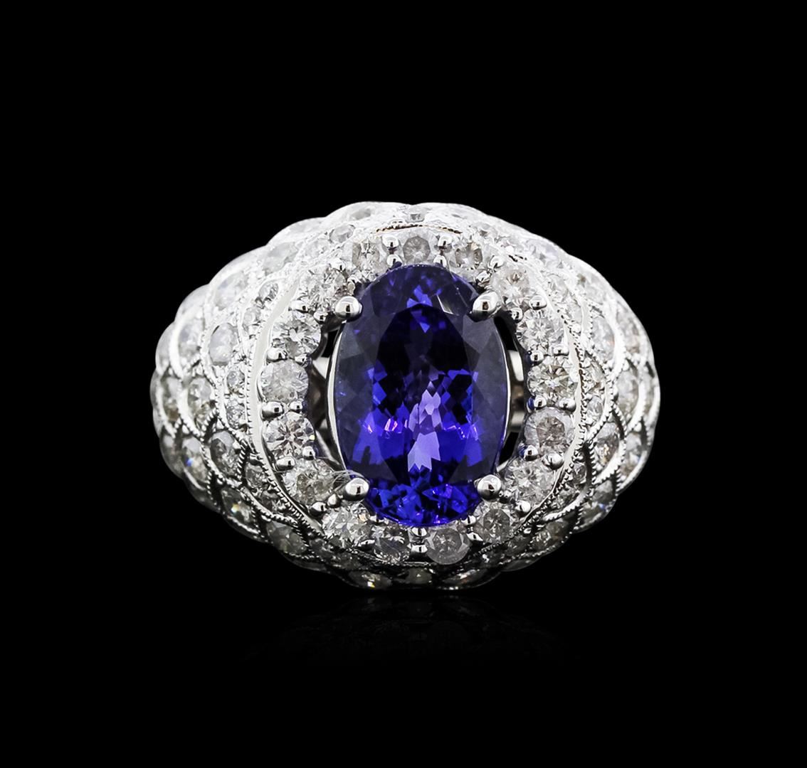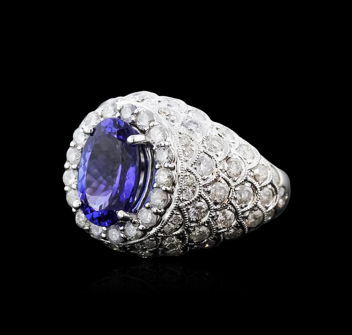 One electronically tested 14KT white gold ladies cast tanzanite and diamond ring with a bright polish finish. Identified with markings of "14K". Condition is new. Containing: One prong set oval modified brilliant cut natural tanzanite, measuring 11.50 x 7.60 x 4.95mm, approximate weight of 3.04ct., clarity is eye clean, type I, medium light, very slightly grayish, violetish blue color, (GIA vB 4/3), cut is good. Eighty prong set round brilliant cut diamonds, measuring 1.90 - 1.20 x 0.93mm (depth est.) approximate total weight of 80 Stones = 1.09ct. Clarity: SI-2 to I-2. Color: I - J. All diamonds and colored gemstones are graded in the mounting, unless otherwise stated. Colored gemstones are presumed to have been subjected to commonly used enhancement processes. Total Weight of Colored Stones 3.04ct. Total Weight of Diamonds 1.09ct. Total Weight of Ring 10.40 grams. GGL Appraised at $7,350.00.