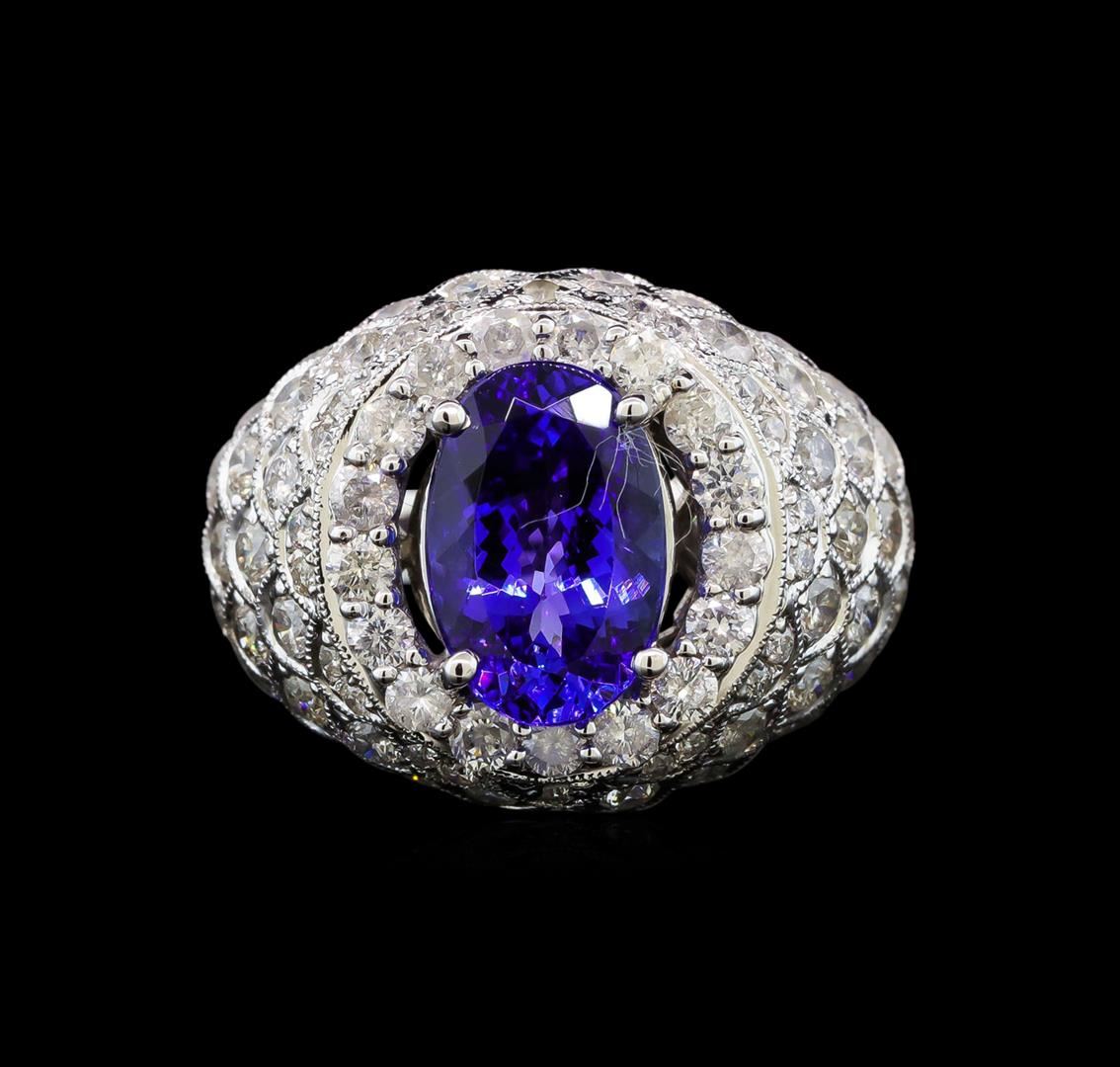 One electronically tested 14KT white gold ladies cast tanzanite and diamond ring with a bright polish finish. Identified with markings of "14K". Condition is new. Containing: One prong set oval modified brilliant cut natural tanzanite, measuring 11.50 x 7.60 x 4.95mm, approximate weight of 3.04ct., clarity is eye clean, type I, medium light, very slightly grayish, violetish blue color, (GIA vB 4/3), cut is good. Eighty prong set round brilliant cut diamonds, measuring 1.90 - 1.20 x 0.93mm (depth est.) approximate total weight of 80 Stones = 1.09ct. Clarity: SI-2 to I-2. Color: I - J. All diamonds and colored gemstones are graded in the mounting, unless otherwise stated. Colored gemstones are presumed to have been subjected to commonly used enhancement processes. Total Weight of Colored Stones 3.04ct. Total Weight of Diamonds 1.09ct. Total Weight of Ring 10.40 grams. GGL Appraised at $7,350.00.