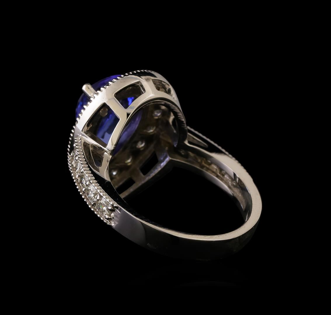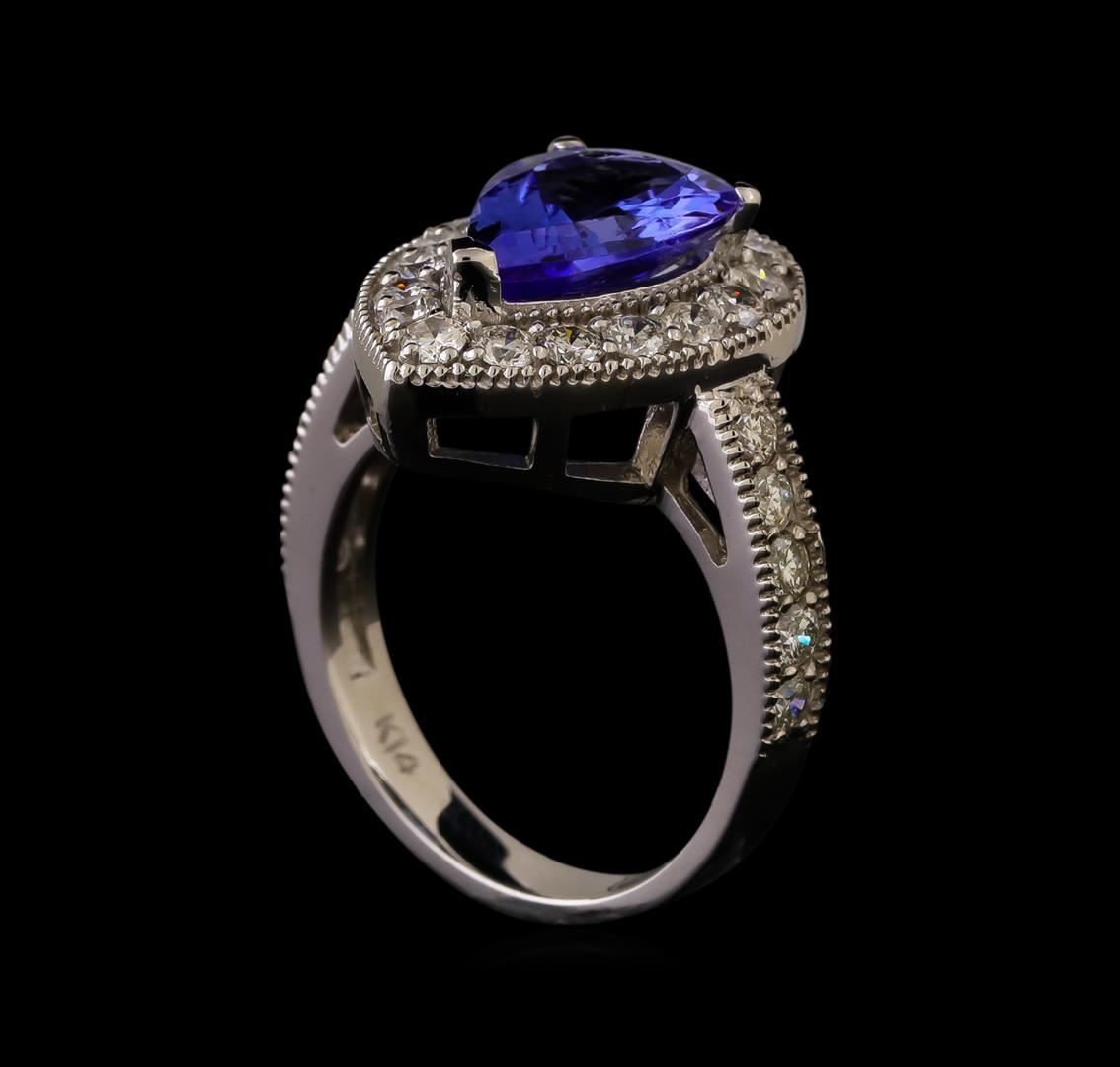 One electronically tested 14KT white gold ladies cast tanzanite & diamond ring with a bright and milgrain finish. The featured tanzanite is set within a diamond bezel, supported by diamond set shoulders, completed by a three millimeter wide band. Trademark is K14. Condition is new, good workmanship. Containing: One prong set pear brilliant cut natural tanzanite, measuring 12.00 x 9.00 x 4.40mm, approximate weight of 3.04ct., clarity is eye clean, type I, medium dark, slightly grayish, bluish violet color, (GIA bV 6/2), cut is good. Transmitting light with no distortion, transparent. Graded in the setting. Tanzanite is a very rare gemstone that is only found in the country of Tanzania. Originally discovered in 1967. Tiffany & Company, named the stone Tanzanite. It is found in the Usumburu Mountains that border the Umba Valley of northern Tanzania. Tanzanite occurs in gray, brown, violet, blue, reddish-purple, & green. The gem is interesting because of its exceptional pleochroism. Rotated in different directions a tanzanite will exhibit multiple changes of color. Tanzanite has a low tolerance to ultrasonic cleaning, and should not be cleaned using this method. Twenty-Seven prong set round brilliant cut diamonds, measuring 2.30 - 2.20 x 1.40mm (depth est.) approximate total weight of 27 Stones = 1.18ct. Graded in the setting. Clarity: SI-2 to I-1. Color: H - J. Total Weight of Colored Stones 3.04ct. Total Weight of Diamonds 1.18ct. Total Weight of Ring 6.70 grams. AIG Appraised at $10,400.00.
