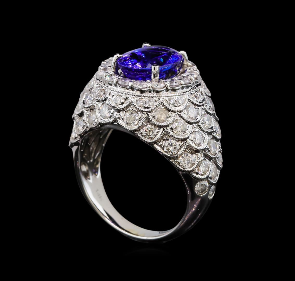 One electronically tested 14KT white gold ladies cast tanzanite and diamond ring with a bright polish finish. Identified with markings of "14K". Condition is new. Containing: One prong set oval modified brilliant cut natural tanzanite, measuring 11.50 x 7.60 x 4.95mm, approximate weight of 3.04ct., clarity is eye clean, type I, medium light, very slightly grayish, violetish blue color, (GIA vB 4/3), cut is good. Eighty prong set round brilliant cut diamonds, measuring 1.90 - 1.20 x 0.93mm (depth est.) approximate total weight of 80 Stones = 1.09ct. Clarity: SI-2 to I-2. Color: I - J. All diamonds and colored gemstones are graded in the mounting, unless otherwise stated. Colored gemstones are presumed to have been subjected to commonly used enhancement processes. Total Weight of Colored Stones 3.04ct. Total Weight of Diamonds 1.09ct. Total Weight of Ring 10.40 grams. GGL Appraised at $7,350.00.