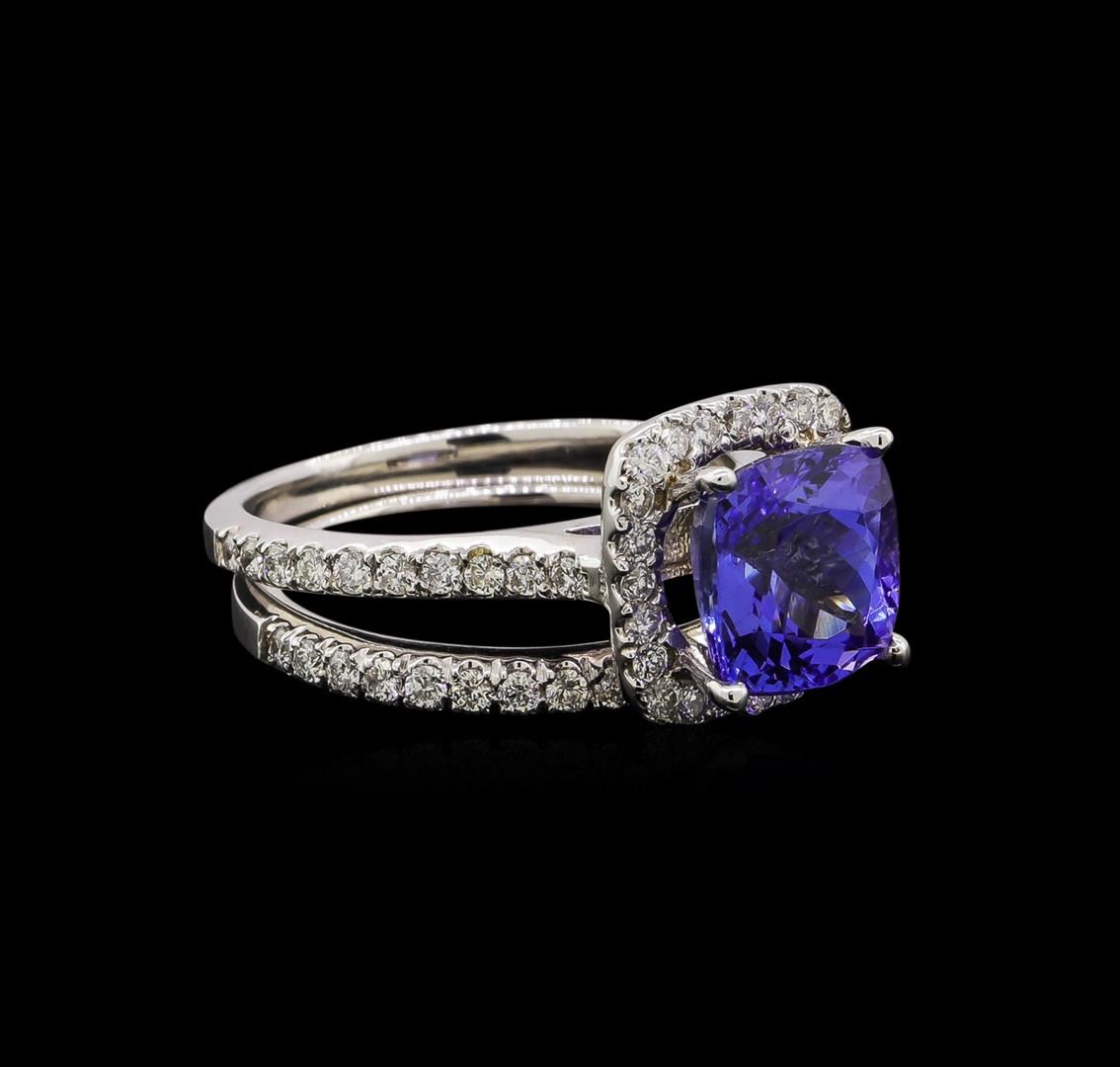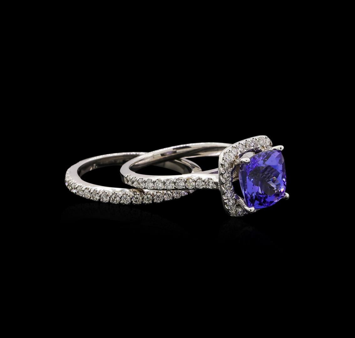 One electronically tested 14KT white gold ladies cast tanzanite and diamond ring & wedding band with a bright polish finish. Identified with markings of "14KT". Condition is new. Containing: One prong set square cushion modified brilliant cut natural tanzanite, measuring 8.40 x 8.40 x 5.47mm, approximate weight of 3.04ct., clarity is eye clean, type I, medium light, very slightly grayish, violet color, (GIA V 4/3), cut is very good. Sixty-Two prong set round brilliant cut diamonds, measuring 1.50 - 1.50 x 0.90mm (depth est.) approximate total weight of 62 Stones = 0.76ct. Clarity: SI-1 to I-1. Color: I - J, Cut is Good. Colored gemstones are presumed to have been subjected to commonly used enhancement processes. All diamonds and colored gemstones are graded in the mounting, unless otherwise stated. Total Weight of Colored Stones 3.04ct. Total Weight of Diamonds 0.76ct. Total Weight of Ring & Wedding Band 6.90 grams. GGL Appraised at $4,785.00.