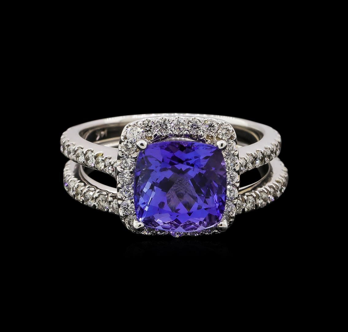 One electronically tested 14KT white gold ladies cast tanzanite and diamond ring & wedding band with a bright polish finish. Identified with markings of "14KT". Condition is new. Containing: One prong set square cushion modified brilliant cut natural tanzanite, measuring 8.40 x 8.40 x 5.47mm, approximate weight of 3.04ct., clarity is eye clean, type I, medium light, very slightly grayish, violet color, (GIA V 4/3), cut is very good. Sixty-Two prong set round brilliant cut diamonds, measuring 1.50 - 1.50 x 0.90mm (depth est.) approximate total weight of 62 Stones = 0.76ct. Clarity: SI-1 to I-1. Color: I - J, Cut is Good. Colored gemstones are presumed to have been subjected to commonly used enhancement processes. All diamonds and colored gemstones are graded in the mounting, unless otherwise stated. Total Weight of Colored Stones 3.04ct. Total Weight of Diamonds 0.76ct. Total Weight of Ring & Wedding Band 6.90 grams. GGL Appraised.