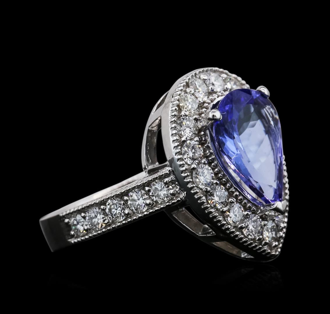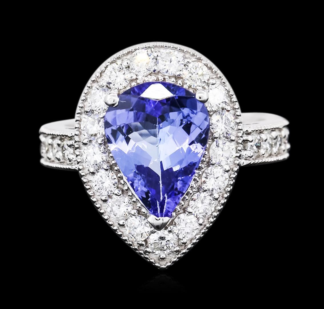 One electronically tested 14KT white gold ladies cast tanzanite & diamond ring with a bright and milgrain finish. The featured tanzanite is set within a diamond bezel, supported by diamond set shoulders, completed by a three millimeter wide band. Trademark is K14. Condition is new, good workmanship. Containing: One prong set pear brilliant cut natural tanzanite, measuring 12.00 x 9.00 x 4.40mm, approximate weight of 3.04ct., clarity is eye clean, type I, medium dark, slightly grayish, bluish violet color, (GIA bV 6/2), cut is good. Transmitting light with no distortion, transparent. Graded in the setting. Tanzanite is a very rare gemstone that is only found in the country of Tanzania. Originally discovered in 1967. Tiffany & Company, named the stone Tanzanite. It is found in the Usumburu Mountains that border the Umba Valley of northern Tanzania. Tanzanite occurs in gray, brown, violet, blue, reddish-purple, & green. The gem is interesting because of its exceptional pleochroism. Rotated in different directions a tanzanite will exhibit multiple changes of color. Tanzanite has a low tolerance to ultrasonic cleaning, and should not be cleaned using this method. Twenty-Seven prong set round brilliant cut diamonds, measuring 2.30 - 2.20 x 1.40mm (depth est.) approximate total weight of 27 Stones = 1.18ct. Graded in the setting. Clarity: SI-2 to I-1. Color: H - J. Total Weight of Colored Stones 3.04ct. Total Weight of Diamonds 1.18ct. Total Weight of Ring 6.70 grams. AIG Appraised at $10,400.00.