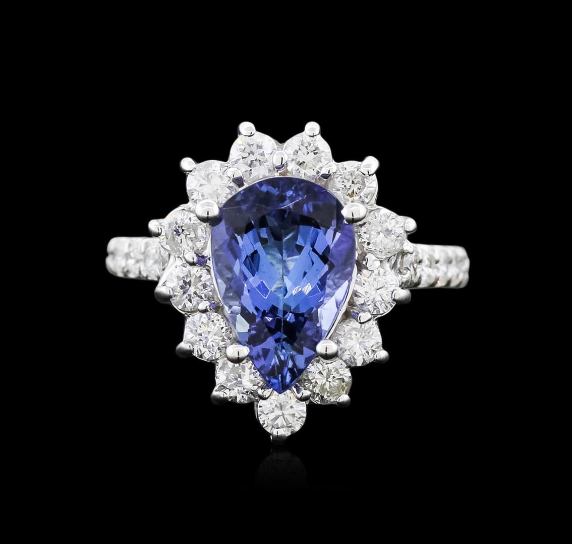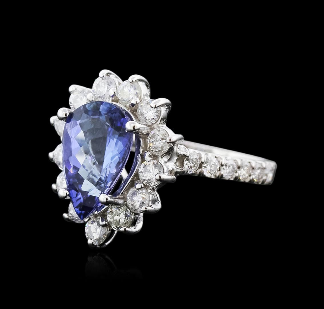 One electronically tested 14KT white gold ladies cast tanzanite and diamond ring with a half round shank with a bright polish finish. Identified with markings of "14K". Condition is new. Containing: One prong set pear modified brilliant cut natural tanzanite, measuring 11.50 x 7.80 x 5.07mm, approximate weight of 3.05ct., clarity is eye clean, type I, medium light, very slightly grayish, violet color, (GIA V 4/3), cut is good. Twenty-Eight prong set round brilliant cut diamonds, measuring 2.50 - 2.00 x 1.35mm (depth est.) approximate total weight of 28 Stones = 1.00ct. Clarity: SI-2 to I-1. Color: I - J. All diamonds and colored gemstones are graded in the mounting, unless otherwise stated. Colored gemstones are presumed to have been subjected to commonly used enhancement processes. Total Weight of Colored Stones 3.05ct. Total Weight of Diamonds 1.00ct. Total Weight of Ring 4.80 grams. GGL Appraised at $5,775.00.