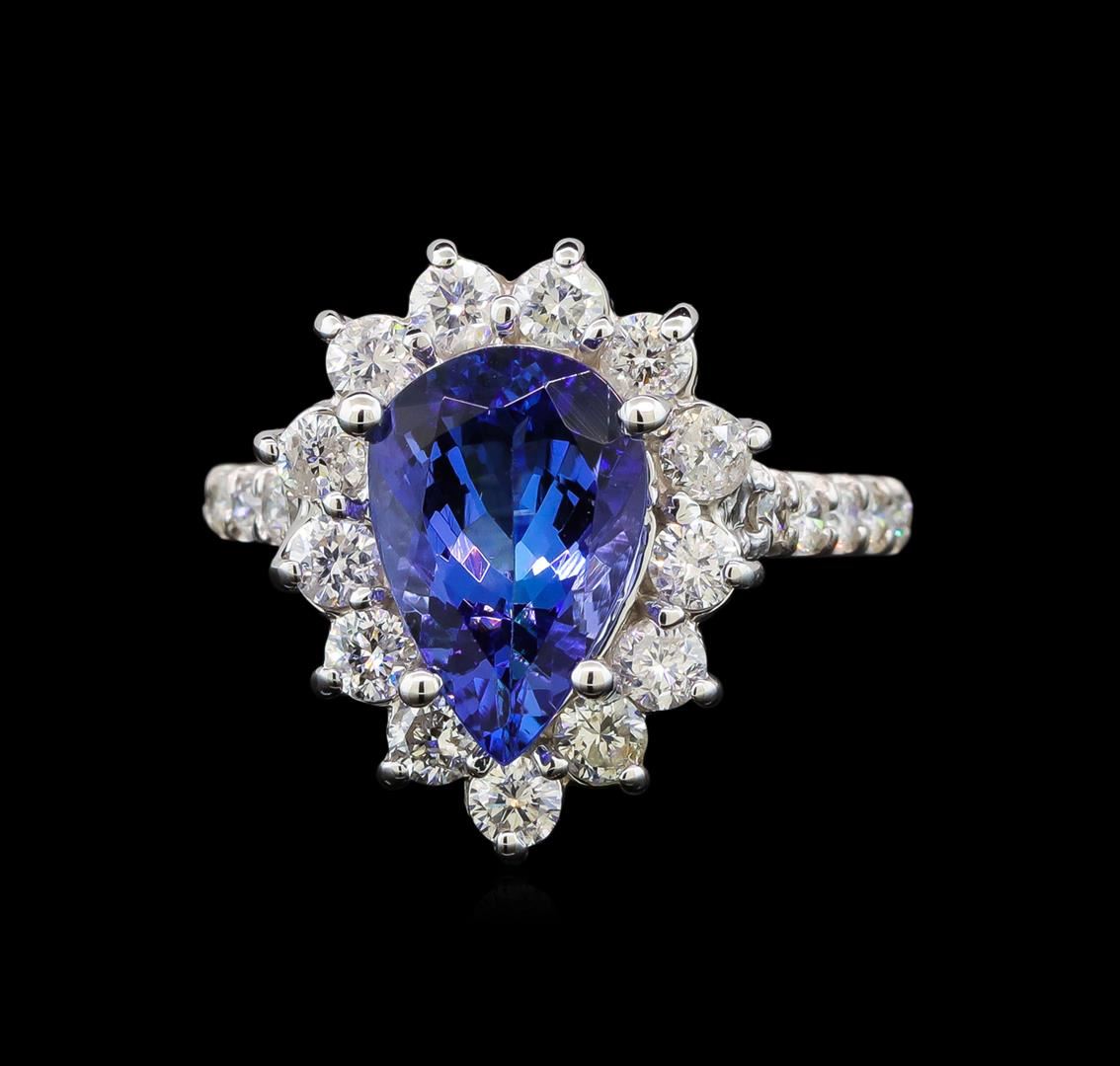 One electronically tested 14KT white gold ladies cast tanzanite and diamond ring with a half round shank with a bright polish finish. Identified with markings of "14K". Condition is new. Containing: One prong set pear modified brilliant cut natural tanzanite, measuring 11.50 x 7.80 x 5.07mm, approximate weight of 3.05ct., clarity is eye clean, type I, medium light, very slightly grayish, violet color, (GIA V 4/3), cut is good. Twenty-Eight prong set round brilliant cut diamonds, measuring 2.50 - 2.00 x 1.35mm (depth est.) approximate total weight of 28 Stones = 1.00ct. Clarity: SI-2 to I-1. Color: I - J. All diamonds and colored gemstones are graded in the mounting, unless otherwise stated. Colored gemstones are presumed to have been subjected to commonly used enhancement processes. Total Weight of Colored Stones 3.05ct. Total Weight of Diamonds 1.00ct. Total Weight of Ring 4.80 grams. GGL Appraised at $5,775.00.