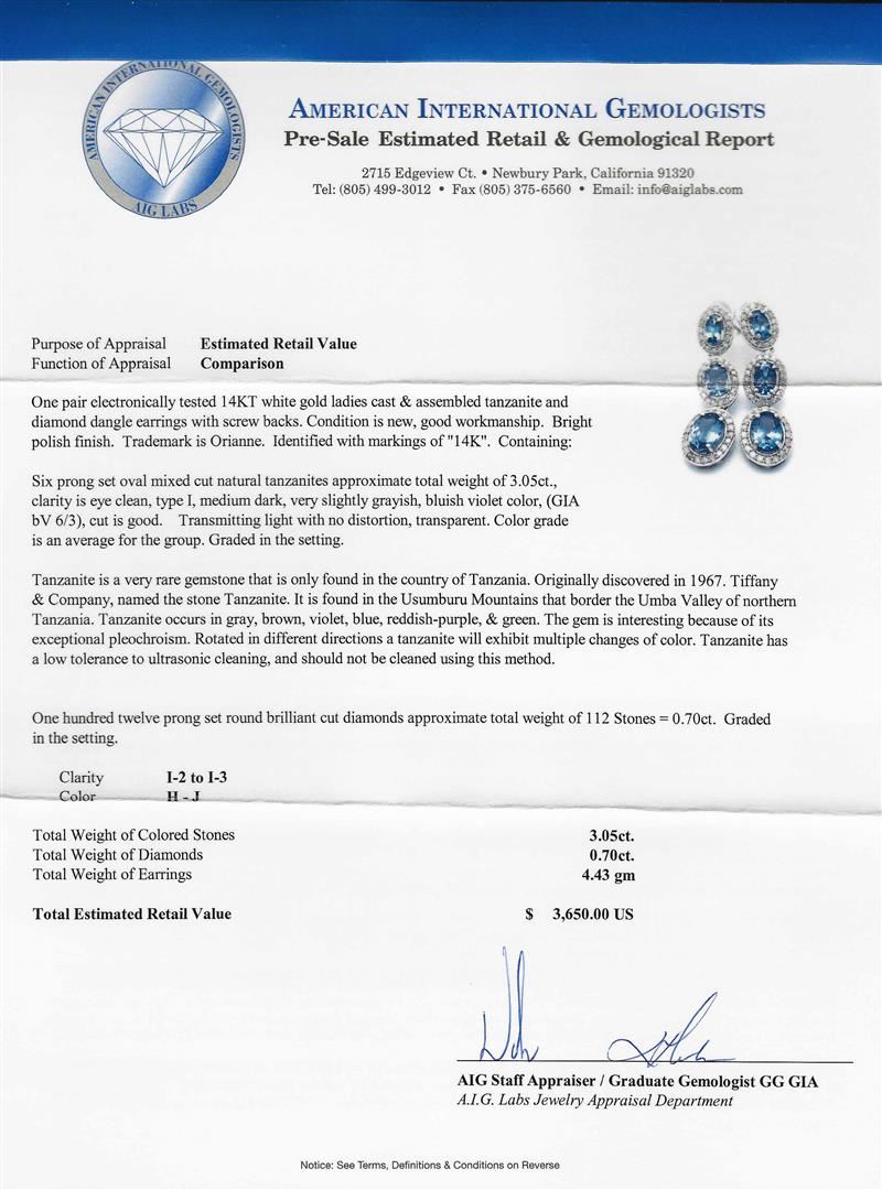 One pair electronically tested 14KT white gold ladies cast & assembled tanzanite and diamond dangle earrings with screw backs. Bright polish finish. Trademark is Orianne. Identified with markings of "14K". Condition is new, good workmanship. Containing: Six prong set oval mixed cut natural tanzanites approximate total weight of 3.05ct., clarity is eye clean, type I, medium dark, very slightly grayish, bluish violet color, (GIA bV 6/3), cut is good. Transmitting light with no distortion, transparent. Color grade is an average for the group. Graded in the setting.Tanzanite is a very rare gemstone that is only found in the country of Tanzania. Originally discovered in 1967. Tiffany & Company, named the stone Tanzanite. It is found in the Usumburu Mountains that border the Umba Valley of northern Tanzania. Tanzanite occurs in gray, brown, violet, blue, reddish-purple, & green. The gem is interesting because of its exceptional pleochroism. Rotated in different directions a tanzanite will exhibit multiple changes of color. Tanzanite has a low tolerance to ultrasonic cleaning, and should not be cleaned using this method.One Hundred Twelve prong set round brilliant cut diamonds approximate total weight of 112 Stones = 0.70ct. Graded in the setting. Clarity: I-2 to I-3. Color: H - J. Total Weight of Colored Stones 3.05ct. Total Weight of Diamonds 0.70ct. AIG Appraised at $3,650.00.