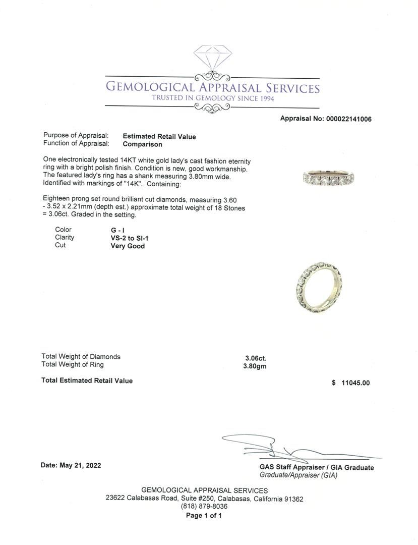 Appraisal No: 000022141006 One electronically tested 14KT white gold lady's cast fashion eternity ring with a bright polish finish. Condition is new, good workmanship. The featured lady's ring has a shank measuring 3.80mm wide. Identified with markings