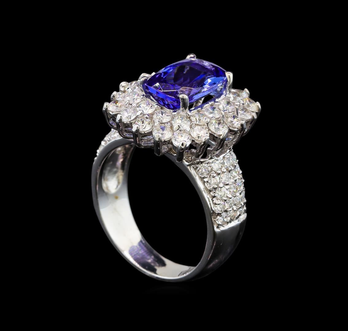 One electronically tested 14KT white gold ladies cast tanzanite and diamond ring with a bright polish finish. Identified with markings of "14K". Condition is new. Containing: One prong set rectangular cushion modified brilliant cut natural tanzanite, measuring 11.30 x 7.27 x 4.73mm, approximate weight of 3.06ct., clarity is eye clean, type I, medium light, very slightly grayish, violet color, (GIA V 4/3), cut is good. Fifty-Five prong set round brilliant cut diamonds, measuring 2.50 - 1.50 x 1.20mm (depth est.) approximate total weight of 55 Stones = 1.61ct. Clarity: SI-1 to I-1. Color: H - I, Cut is Good. Colored gemstones are presumed to have been subjected to commonly used enhancement processes. All diamonds and colored gemstones are graded in the mounting, unless otherwise stated. Total Weight of Colored Stones 3.06ct. Total Weight of Diamonds 1.61ct. Total Weight of Ring 8.00. grams. GGL Appraised at $6,230.00.