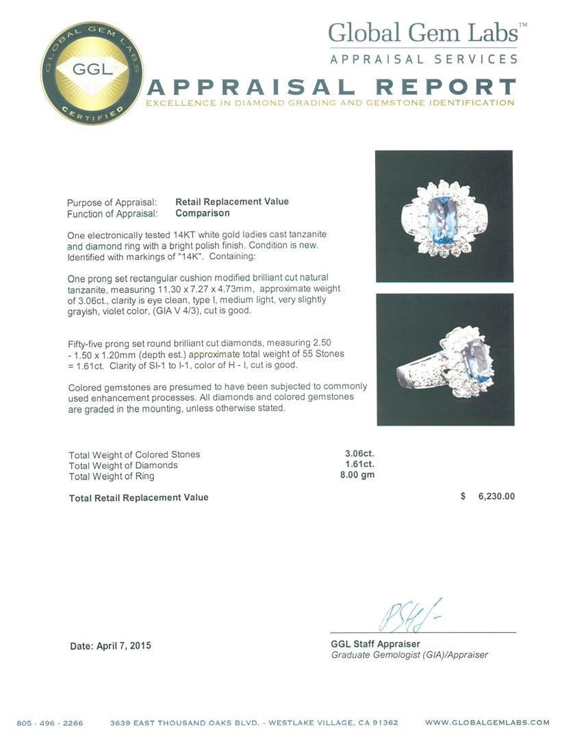 One electronically tested 14KT white gold ladies cast tanzanite and diamond ring with a bright polish finish. Identified with markings of "14K". Condition is new. Containing: One prong set rectangular cushion modified brilliant cut natural tanzanite, measuring 11.30 x 7.27 x 4.73mm, approximate weight of 3.06ct., clarity is eye clean, type I, medium light, very slightly grayish, violet color, (GIA V 4/3), cut is good. Fifty-Five prong set round brilliant cut diamonds, measuring 2.50 - 1.50 x 1.20mm (depth est.) approximate total weight of 55 Stones = 1.61ct. Clarity: SI-1 to I-1. Color: H - I, Cut is Good. Colored gemstones are presumed to have been subjected to commonly used enhancement processes. All diamonds and colored gemstones are graded in the mounting, unless otherwise stated. Total Weight of Colored Stones 3.06ct. Total Weight of Diamonds 1.61ct. Total Weight of Ring 8.00. grams. GGL Appraised.