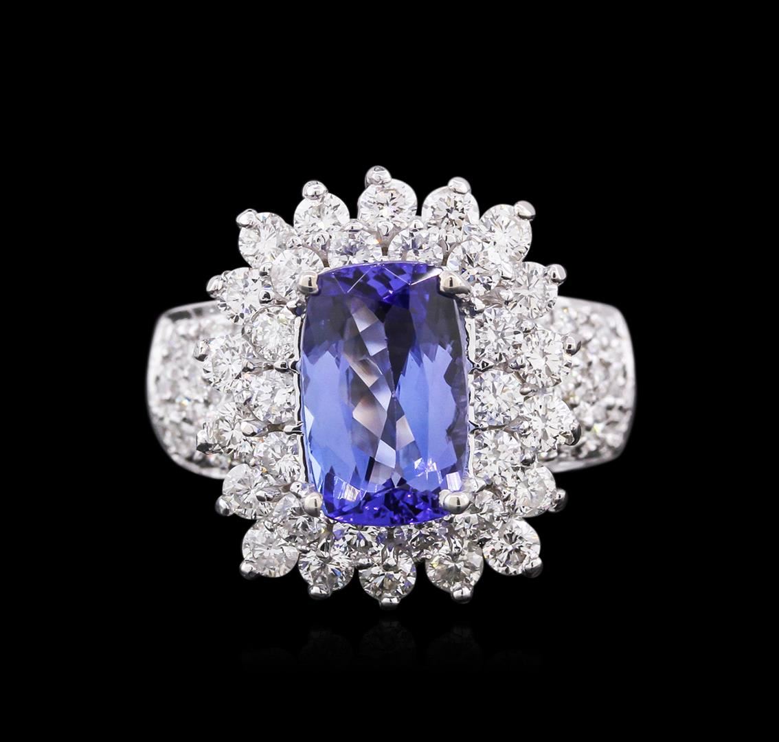 One electronically tested 14KT white gold ladies cast tanzanite and diamond ring with a bright polish finish. Identified with markings of "14K". Condition is new. Containing: One prong set rectangular cushion modified brilliant cut natural tanzanite, measuring 11.30 x 7.27 x 4.73mm, approximate weight of 3.06ct., clarity is eye clean, type I, medium light, very slightly grayish, violet color, (GIA V 4/3), cut is good. Fifty-Five prong set round brilliant cut diamonds, measuring 2.50 - 1.50 x 1.20mm (depth est.) approximate total weight of 55 Stones = 1.61ct. Clarity: SI-1 to I-1. Color: H - I, Cut is Good. Colored gemstones are presumed to have been subjected to commonly used enhancement processes. All diamonds and colored gemstones are graded in the mounting, unless otherwise stated. Total Weight of Colored Stones 3.06ct. Total Weight of Diamonds 1.61ct. Total Weight of Ring 8.00. grams. GGL Appraised at $6,230.00.