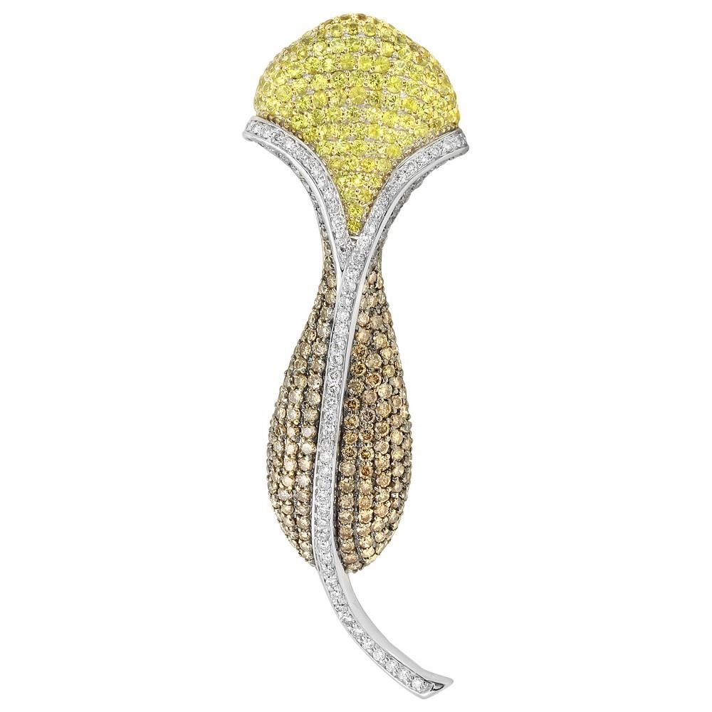 One 14KT White Gold 3.06ctw Yellow Sapphire and Diamond Brooch. (110) Yellow Sapphires with a total weight of 3.06cts. (184) Brown Diamonds with a total weight of 3.77cts. (61) diamonds with a total weight of 0.78cts. Total weight of this brooch is 15.47 grams.
