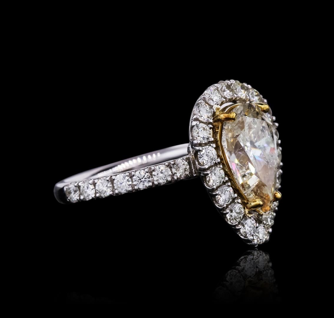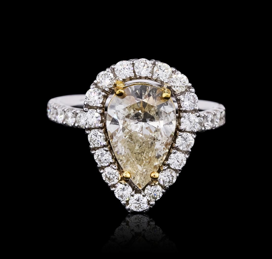 One electronically tested 14KT white gold ladies cast & assembled diamond unity ring with a bright polish finish. Condition is new, good workmanship. The featured diamond is set within a yellow gold basket and placed within a diamond bezel. The ring is supported by diamond set shoulders, completed by a two millimeter wide band. Containing: One prong set pear shaped cut diamond, measuring 12.20 x 7.90 x 5.00mm (depth est.), 5.00% GTCF approximate weight of 3.07ct. Diamond Grading Report attached. Graded in the setting. Clarity I-1. Color L. Depth 63.3%. Table 59.5%. Thirty-two prong set round brilliant cut diamonds, measuring 2.20 - 2.10 x 1.29mm (depth est.) approximate total weight of 32 Stones = 1.18ct. Graded in the setting. Clarity VS-1 to SI-1. Color H -- J. Total Weight of Diamonds 4.25ct. Total Weight of Ring 6.10gm. AIG Appraised at $38,150.00.