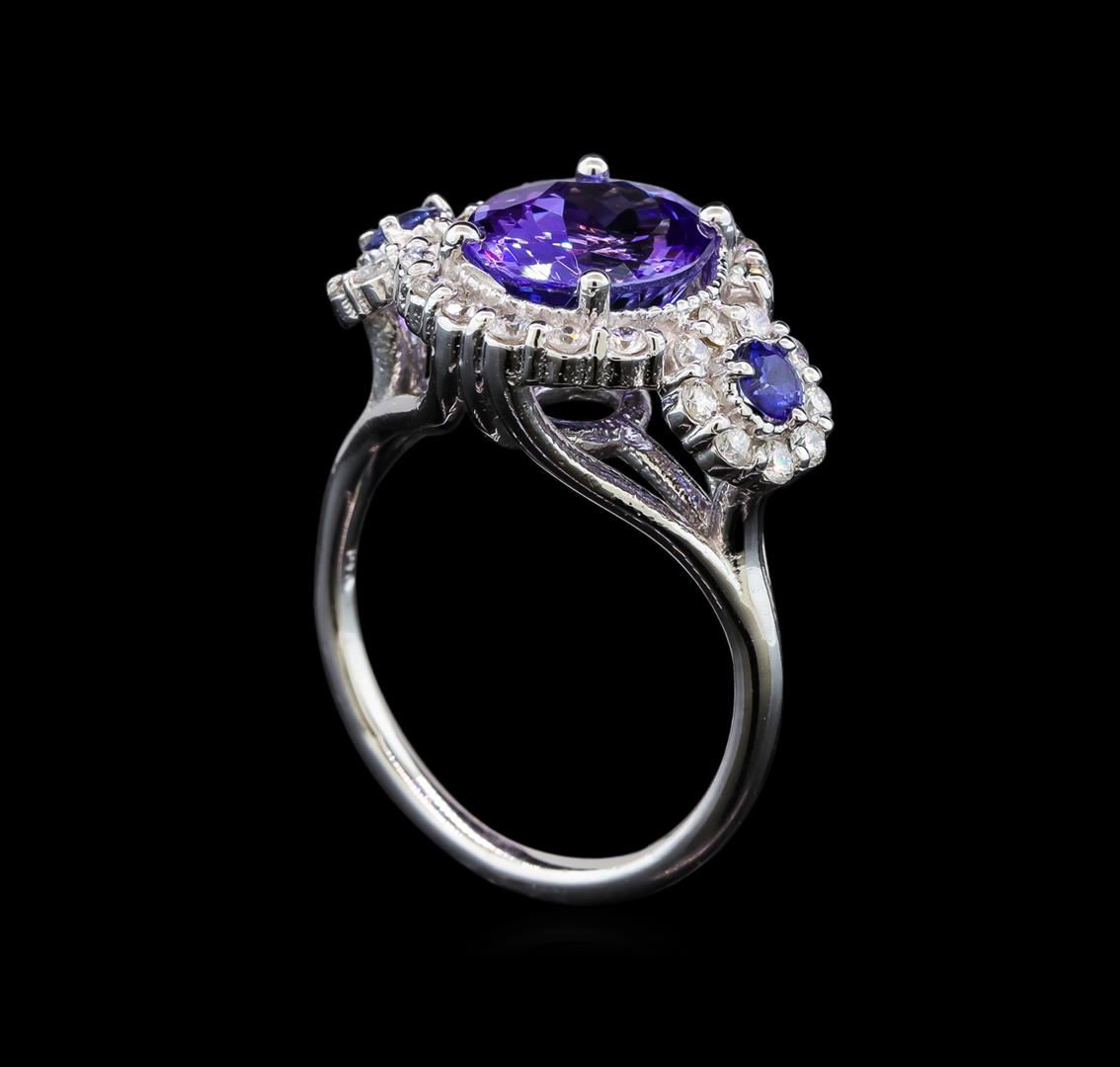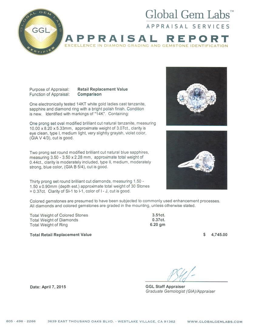 One electronically tested 14KT white gold ladies cast tanzanite, sapphire and diamond ring with a bright polish finish. Identified with markings of "14K". Condition is new. Containing: One prong set oval modified brilliant cut natural tanzanite, measuring 10.00. x 8.20 x 5.33mm, approximate weight of 3.07ct., clarity is eye clean, type I, medium light, very slightly grayish, violet color, (GIA V 4/3), cut is good. Two prong set round modified brilliant cut natural blue sapphires, measuring 3.50 - 3.50 x 2.28 mm, approximate total weight of 0.44ct., clarity is moderately included, type II, medium, moderately strong, blue color, (GIA B 5/4), cut is good. Thirty prong set round brilliant cut diamonds, measuring 1.50 - 1.50 x 0.90mm (depth est.) approximate total weight of 30 Stones = 0.37ct. Clarity: SI-1 to I-1. Color: I - J, Cut is Good. Colored gemstones are presumed to have been subjected to commonly used enhancement processes. All diamonds and colored gemstones are graded in the mounting, unless otherwise stated. Total Weight of Colored Stones 3.51ct. Total Weight of Diamonds 0.37ct. Total Weight of Ring 6.20 grams. GGL Appraised at $4,745.00.
