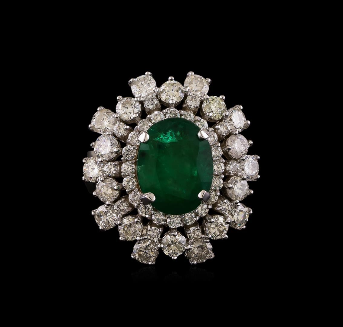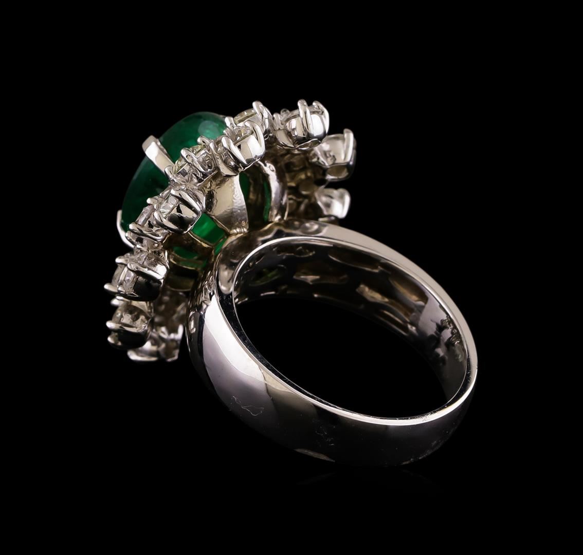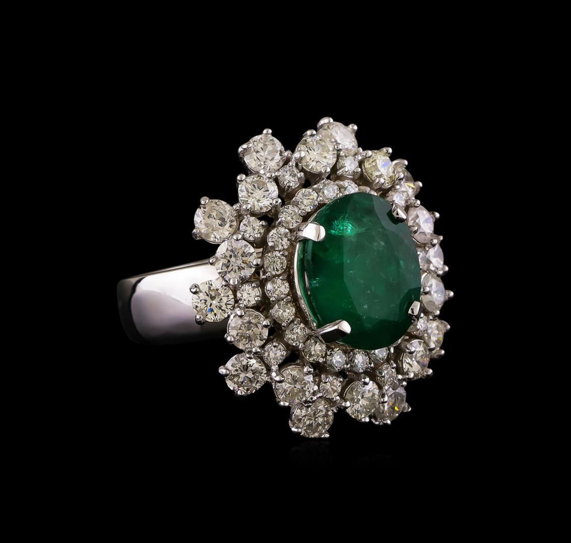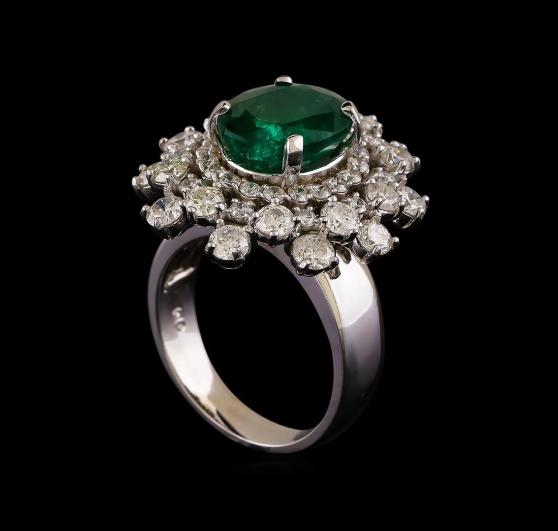One electronically tested 14KT white gold ladies cast emerald and diamond ring with a bright polish finish. The featured emerald is set within stylized tiered diamond bezels, completed by a four millimeter wide band. Identified with markings of "K14". Condition is new, good workmanship. Containing: One prong set oval mixed cut natural emerald, measuring 11.80 x 9.30 x 4.80mm, 6% bulge factor, approximate weight of 3.08ct., clarity is heavily included, type III, medium dark, moderately strong, very slightly bluish green color, (GIA vslbG 6/4), cut is good. Transmitting light somewhat diffusely, transparent to translucent. Naturally occurring internal & external characteristics are present. Indications of oil residue. Graded in the setting. Twenty-Two prong set round brilliant cut diamonds, measuring 3.20 - 3.00 x 1.86mm (depth est.) approximate total weight of 22 Stones = 2.50ct. Graded in the setting. Clarity: SI-1 to I-1. Color: G - I Thirty prong set round brilliant cut diamonds, measuring 1.90 - 1.80 x 1.11mm (depth est.) approximate total weight of 30 Stones = 0.79ct. Graded in the setting. Clarity: SI-1 to I-1. Color: G - I. Total Weight of Colored Stones 3.08ct. Total Weight of Diamonds 3.29ct. Total Weight of Ring 11.87 grams. AIG Appraised at $15,665.00.