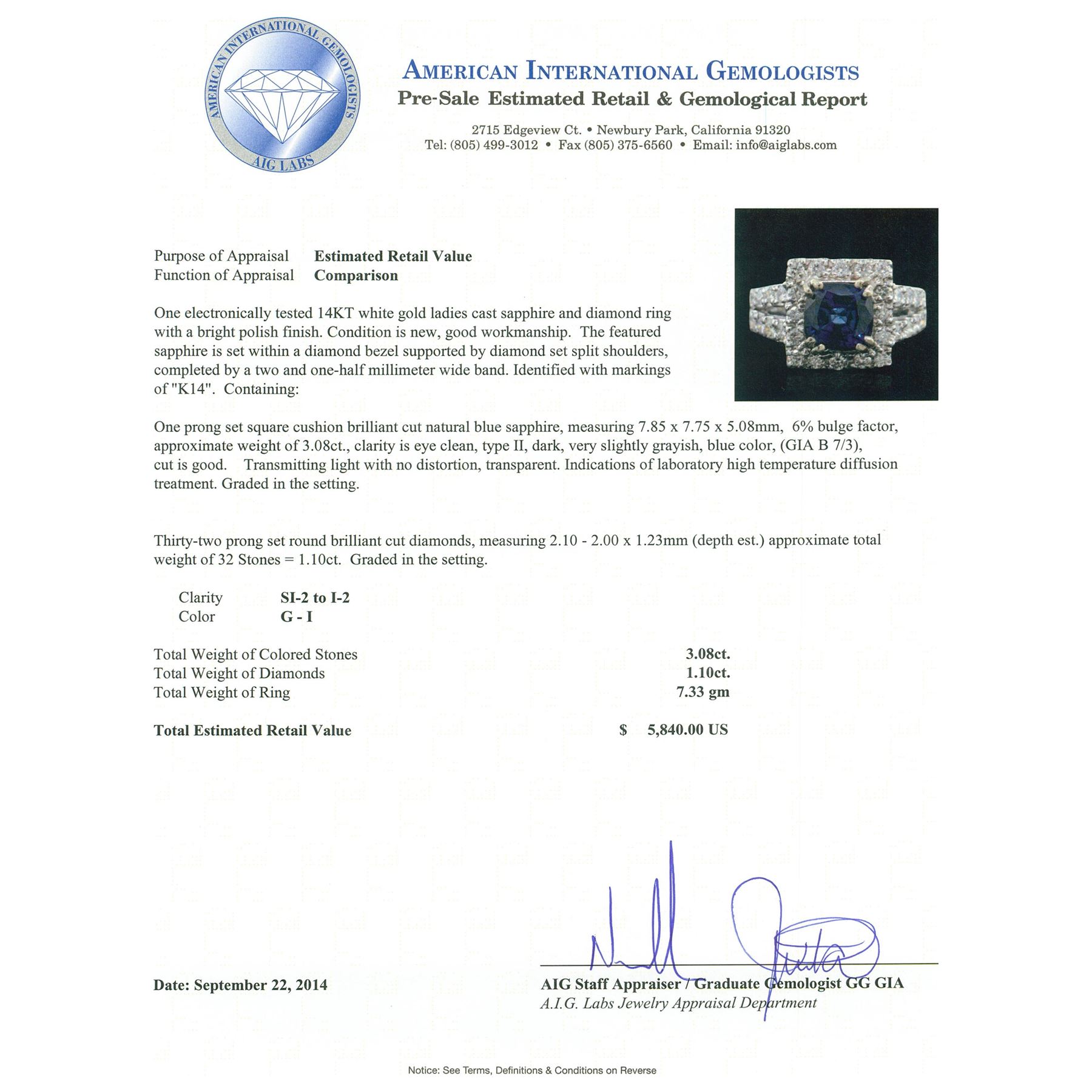 One electronically tested 14KT white gold ladies cast sapphire and diamond ring with a bright polish finish. The featured sapphire is set within a diamond bezel supported by diamond set split shoulders, completed by a two and one-half millimeter wide band. Identified with markings of "K14". Condition is new, good workmanship. Containing: One prong set square cushion brilliant cut natural blue sapphire, measuring 7.85 x 7.75 x 5.08mm, 6% bulge factor, approximate weight of 3.08ct., clarity is eye clean, type II, dark, very slightly grayish, blue color, (GIA B 7/3), cut is good. Transmitting light with no distortion, transparent. Indications of laboratory high temperature diffusion treatment. Graded in the setting. Thirty-Two prong set round brilliant cut diamonds, measuring 2.10 - 2.00 x 1.23mm (depth est.) approximate total weight of 32 Stones = 1.10ct. Graded in the setting. Clarity: SI-2 to I-2. Color: G - I. Total Weight of Colored Stones 3.08ct. Total Weight of Diamonds 1.10ct. Total Weight of Ring 7.33 grams. AIG Appraised.