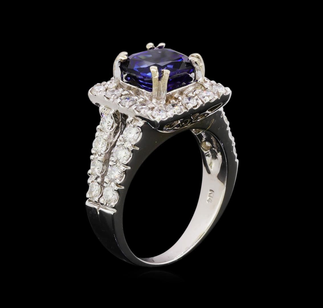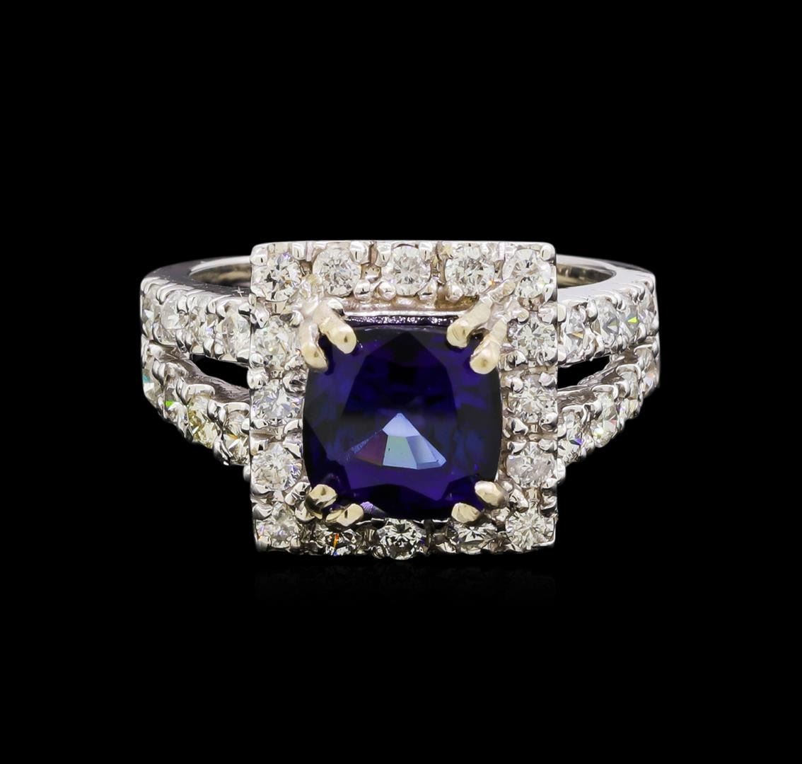 One electronically tested 14KT white gold ladies cast sapphire and diamond ring with a bright polish finish. The featured sapphire is set within a diamond bezel supported by diamond set split shoulders, completed by a two and one-half millimeter wide band. Identified with markings of "K14". Condition is new, good workmanship. Containing: One prong set square cushion brilliant cut natural blue sapphire, measuring 7.85 x 7.75 x 5.08mm, 6% bulge factor, approximate weight of 3.08ct., clarity is eye clean, type II, dark, very slightly grayish, blue color, (GIA B 7/3), cut is good. Transmitting light with no distortion, transparent. Indications of laboratory high temperature diffusion treatment. Graded in the setting. Thirty-Two prong set round brilliant cut diamonds, measuring 2.10 - 2.00 x 1.23mm (depth est.) approximate total weight of 32 Stones = 1.10 ct. Graded in the setting. Clarity: SI-2 to I-2. Color: G - I. Total Weight of Colored Stones 3.08ct. Total Weight of Diamonds 1.10 ct. Total Weight of Ring 7.33 grams. AIG Appraised.