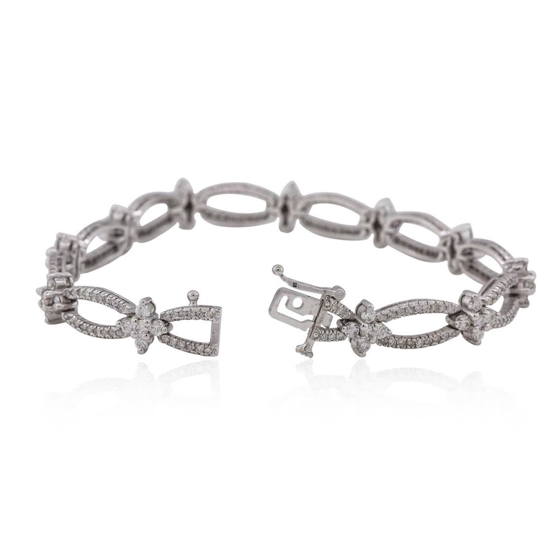 One electronically tested 14KT white gold ladies combination cast & assembled diamond bracelet with a hidden box clasp with safety closer with a bright polish finish. Measurements: 7.25 in length. Condition is new. Containing: One Hundred Ninety-Eight prong set round brilliant cut diamonds, measuring 1.10 - 1.10 x 0.66mm (depth est.) approximate total weight of 198 Stones = 0.95ct. Clarity: I-1 to I-3. Color: I - J, Cut is Good. Fifty-Five prong set round brilliant cut diamonds, measuring 2.20 - 2.20 x 1.32mm (depth est.) approximate total weight of 55 Stones = 2.14ct. Clarity: SI-1 to SI-2. Color: J - K, Cut is Good. All diamonds are graded in the mounting, unless otherwise stated. Total Weight of Diamonds 3.09ct. Total Weight of Bracelet 17.90 grams. GGL Appraised.