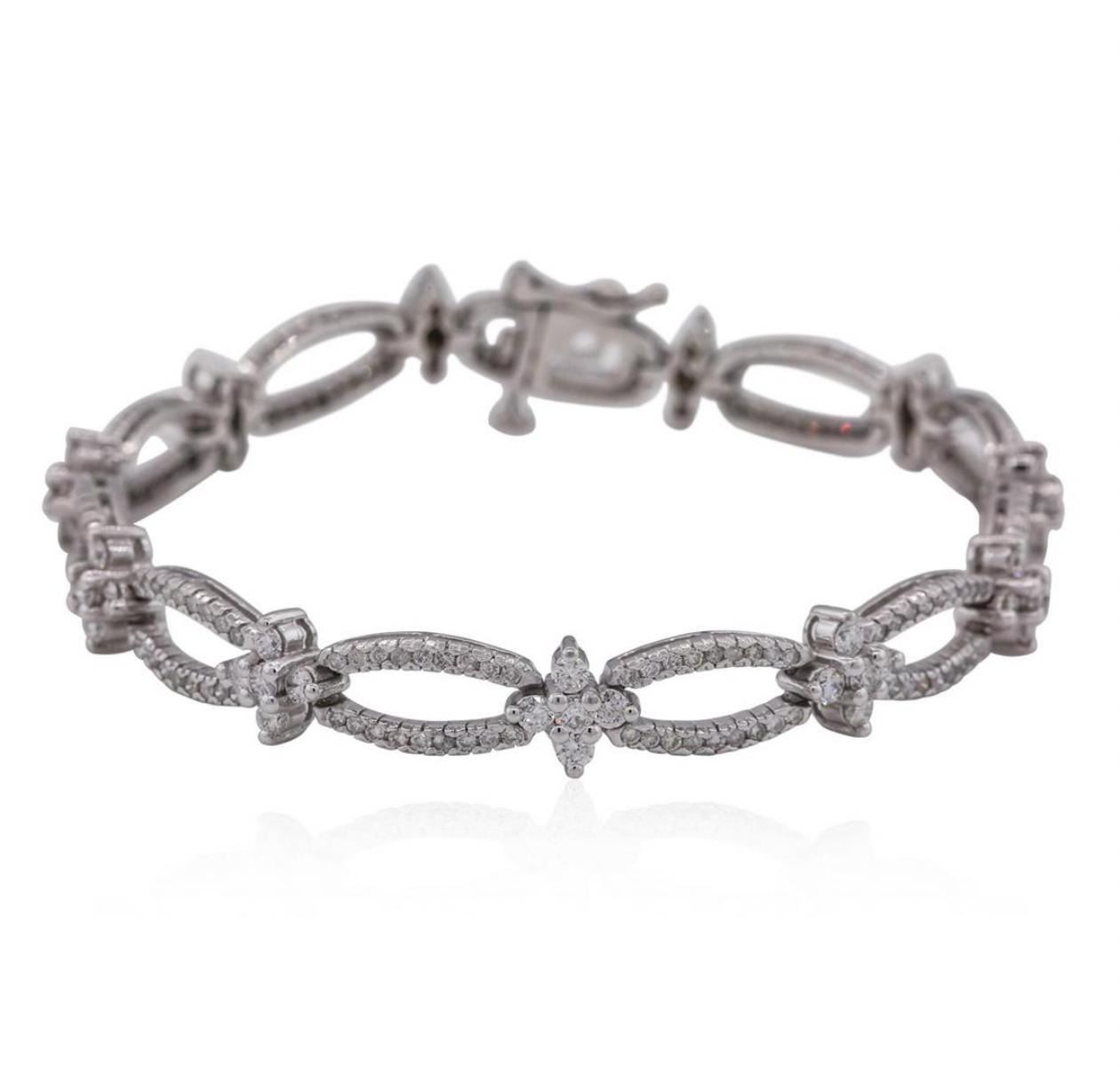 One electronically tested 14KT white gold ladies combination cast & assembled diamond bracelet with a hidden box clasp with safety closer with a bright polish finish. Measurements: 7.25 in length. Condition is new. Containing: One Hundred Ninety-Eight prong set round brilliant cut diamonds, measuring 1.10 - 1.10 x 0.66mm (depth est.) approximate total weight of 198 Stones = 0.95ct. Clarity: I-1 to I-3. Color: I - J, Cut is Good. Fifty-Five prong set round brilliant cut diamonds, measuring 2.20 - 2.20 x 1.32mm (depth est.) approximate total weight of 55 Stones = 2.14ct. Clarity: SI-1 to SI-2. Color: J - K, Cut is Good. All diamonds are graded in the mounting, unless otherwise stated. Total Weight of Diamonds 3.09ct. Total Weight of Bracelet 17.90 grams. GGL Appraised.