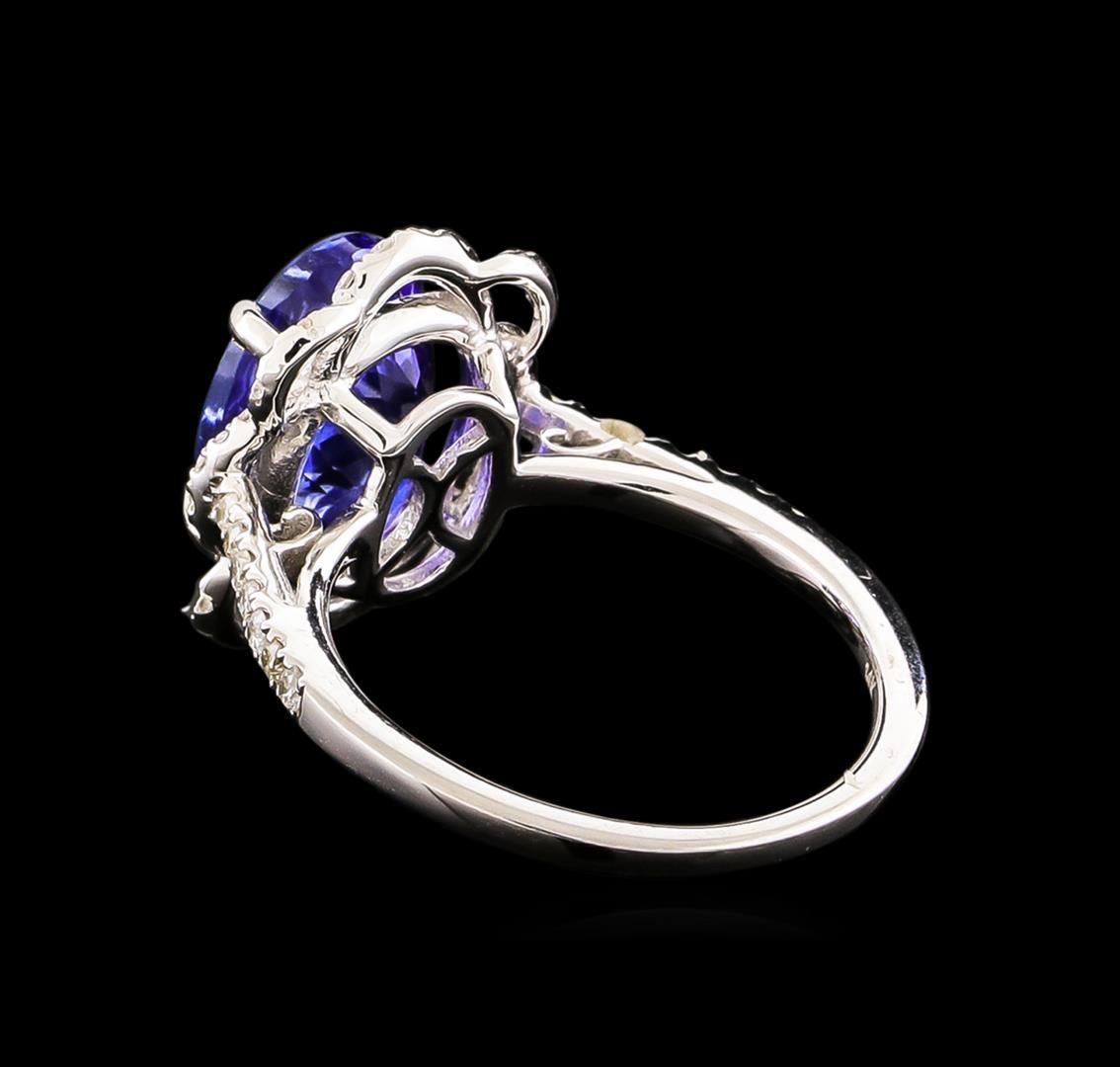 One electronically tested 14KT white gold ladies combination cast & assembled ring with a bright polish finish. Condition is new. Identified with markings of "14K". Containing: One prong set oval modified brilliant cut natural tanzanite, measuring 11.40 x 8.00 x 4.90mm, approximate weight of 3.09ct., clarity is eye clean, type I, medium, very slightly grayish, bluish violet color, (GIA bV 5/3), cut is good. Forty-Six prong set round brilliant cut diamonds, measuring 1.30 - 1.10 x 0.72mm (depth est.) approximate total weight of 46 Stones = 0.29ct. Clarity: I-1 to I-2. Color: H - I, Cut is Good. Colored gemstones are presumed to have been subjected to commonly used enhancement processes. All diamonds and colored gemstones are graded in the mounting, unless otherwise stated. Total Weight of Colored Stones 3.09ct. Total Weight of Diamonds 0.29ct. Total Weight of Ring 4.20 grams. GGL Appraised at $6,020.00.