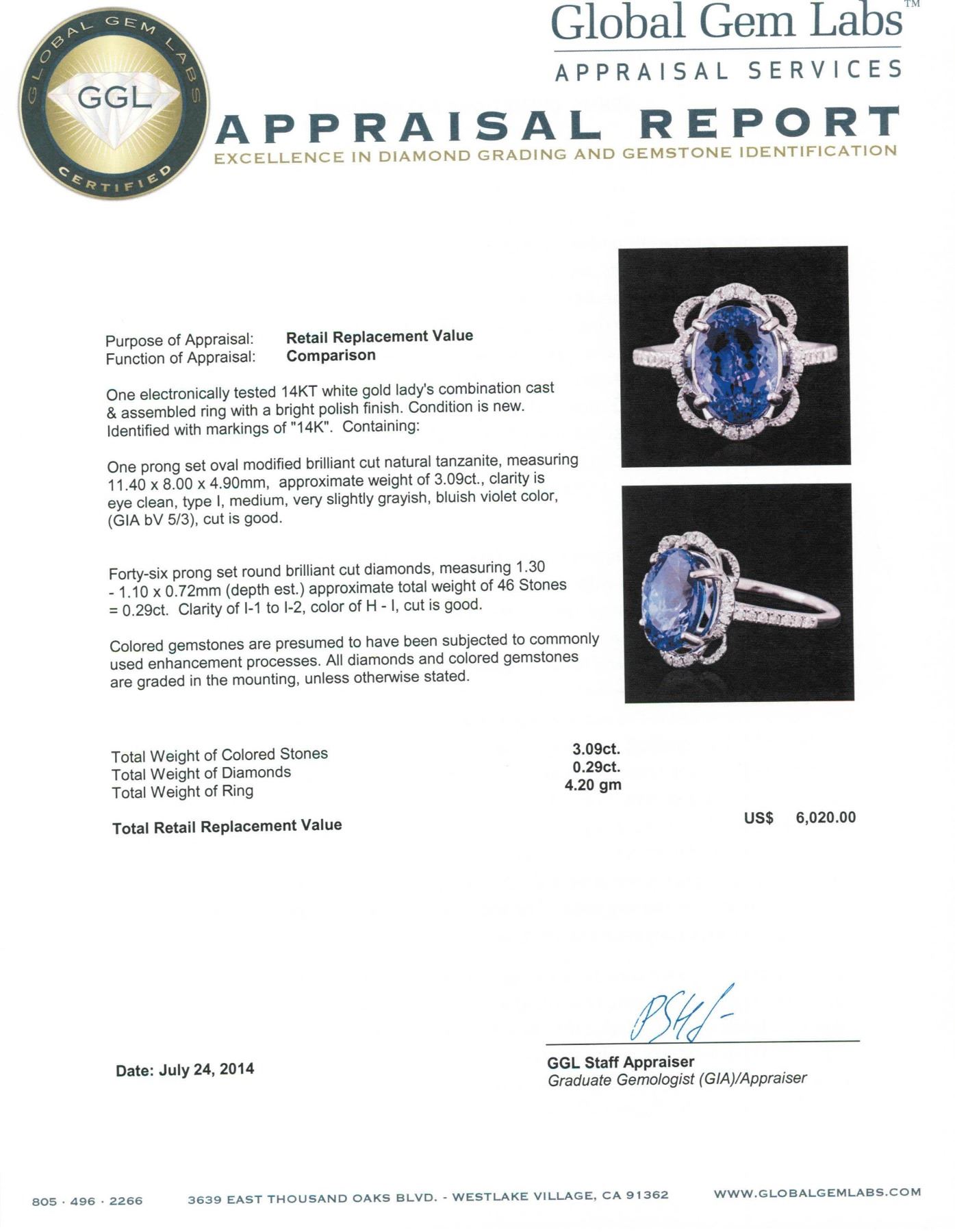 One electronically tested 14KT white gold ladies combination cast & assembled ring with a bright polish finish. Condition is new. Identified with markings of "14K". Containing: One prong set oval modified brilliant cut natural tanzanite, measuring 11.40 x 8.00 x 4.90mm, approximate weight of 3.09ct., clarity is eye clean, type I, medium, very slightly grayish, bluish violet color, (GIA bV 5/3), cut is good. Forty-Six prong set round brilliant cut diamonds, measuring 1.30 - 1.10 x 0.72mm (depth est.) approximate total weight of 46 Stones = 0.29ct. Clarity: I-1 to I-2. Color: H - I, Cut is Good. Colored gemstones are presumed to have been subjected to commonly used enhancement processes. All diamonds and colored gemstones are graded in the mounting, unless otherwise stated. Total Weight of Colored Stones 3.09ct. Total Weight of Diamonds 0.29ct. Total Weight of Ring 4.20 grams. GGL Appraised.