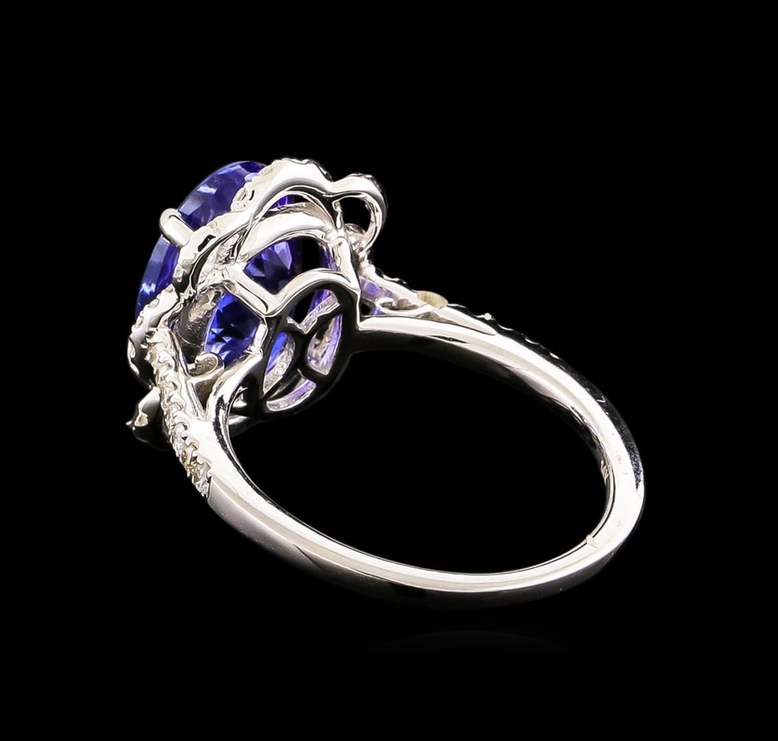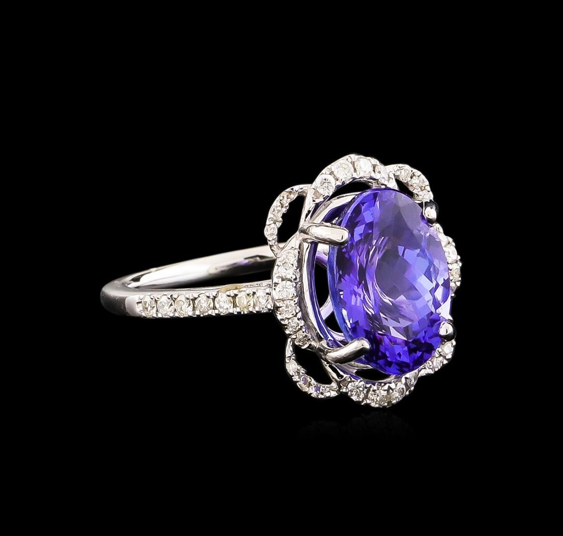 One electronically tested 14KT white gold ladies combination cast & assembled ring with a bright polish finish. Condition is new. Identified with markings of "14K". Containing: One prong set oval modified brilliant cut natural tanzanite, measuring 11.40 x 8.00 x 4.90mm, approximate weight of 3.09ct., clarity is eye clean, type I, medium, very slightly grayish, bluish violet color, (GIA bV 5/3), cut is good. Forty-Six prong set round brilliant cut diamonds, measuring 1.30 - 1.10 x 0.72mm (depth est.) approximate total weight of 46 Stones = 0.29ct. Clarity: I-1 to I-2. Color: H - I, Cut is Good. Colored gemstones are presumed to have been subjected to commonly used enhancement processes. All diamonds and colored gemstones are graded in the mounting, unless otherwise stated. Total Weight of Colored Stones 3.09ct. Total Weight of Diamonds 0.29ct. Total Weight of Ring 4.20 grams. GGL Appraised.