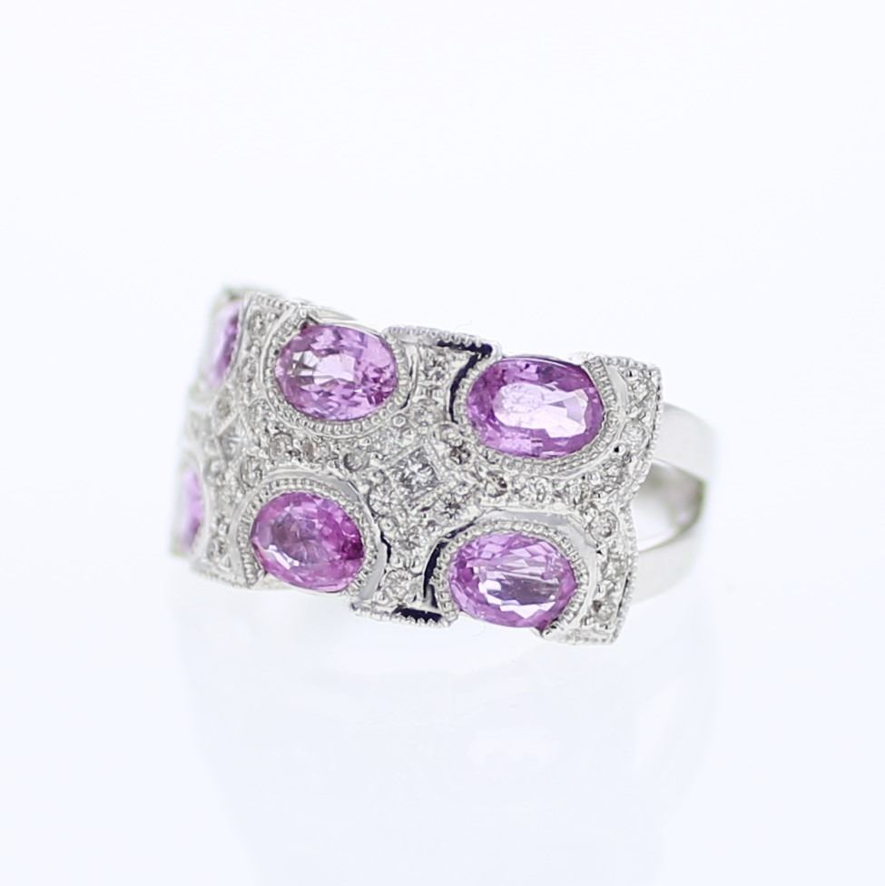 One 14KT White Gold 3.09ctw Sapphire and Diamond Ring. (6) Sapphires with a total weight of 3.09cts. (61) Round Diamonds with a total weight of 0.65cts. (2) Princess cut Diamonds with a total weight of 0.07cts. Total weight of this ring is 7.86 grams.