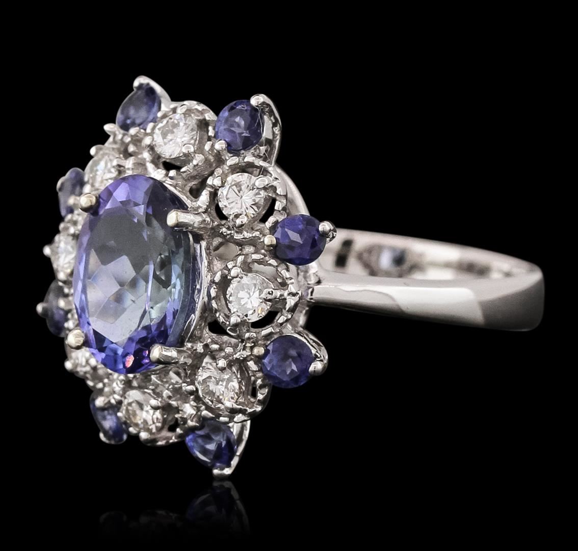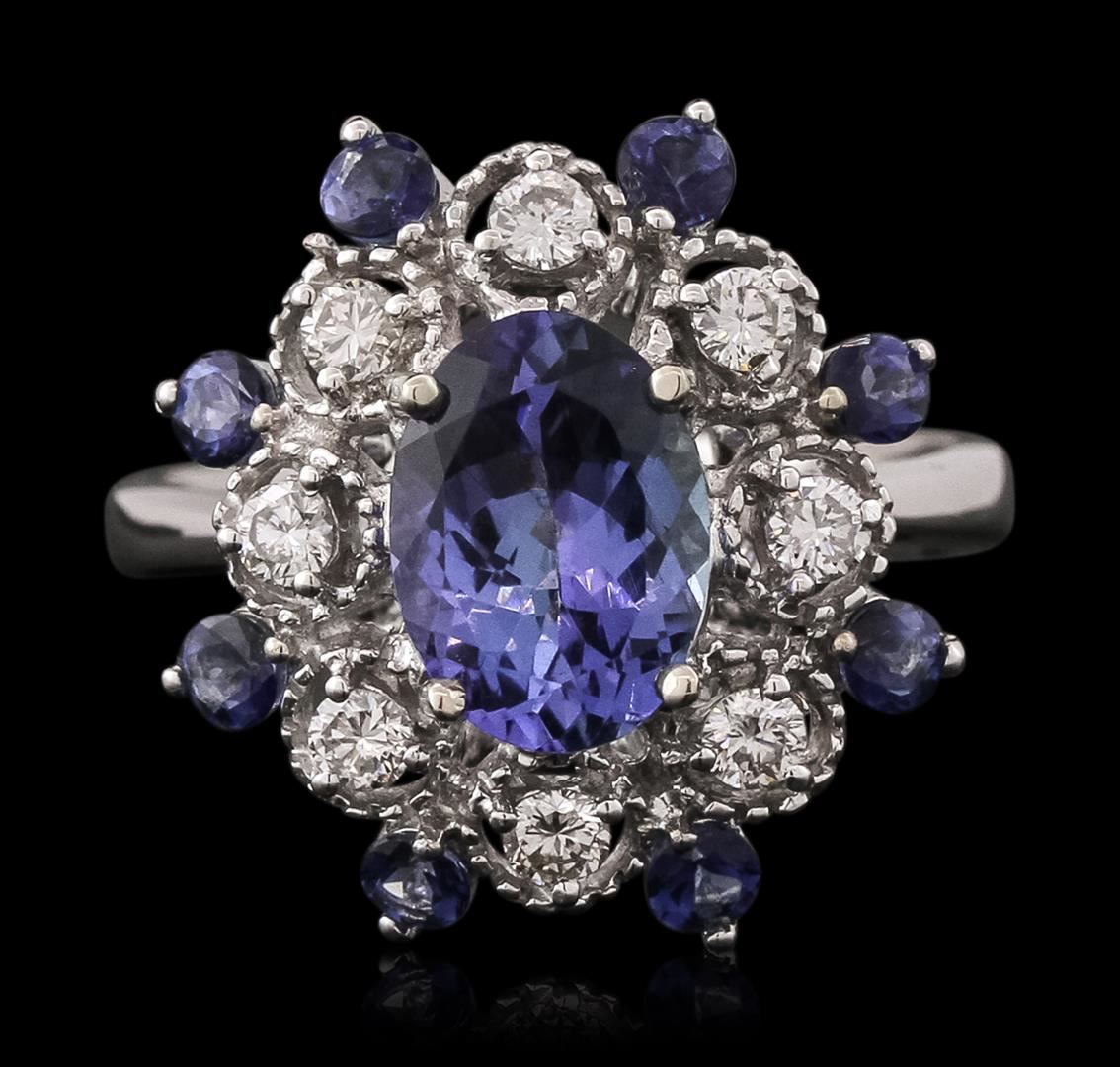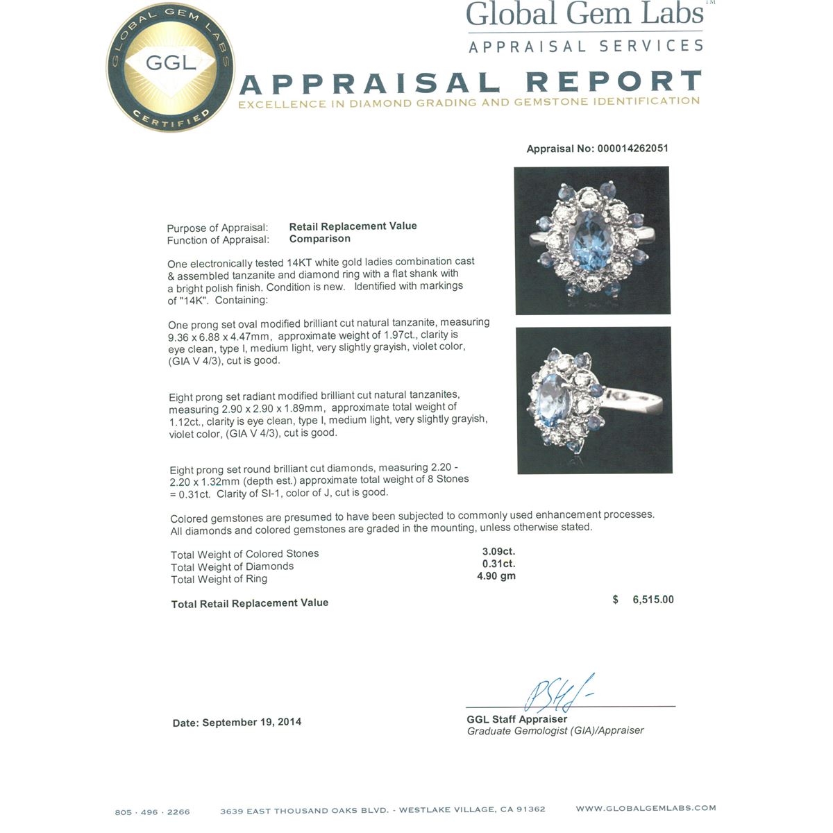 One electronically tested 14KT white gold ladies combination cast & assembled tanzanite and diamond ring with a flat shank with a bright polish finish. Identified with markings of "14K". Condition is new. Containing: One prong set oval modified brilliant cut natural tanzanite, measuring 9.36 x 6.88 x 4.47mm, approximate weight of 1.97ct., clarity is eye clean, type I, medium light, very slightly grayish, violet color, (GIA V 4/3), cut is good. Eight prong set radiant modified brilliant cut natural tanzanites, measuring 2.90 x 2.90 x 1.89mm, approximate total weight of 1.12ct., clarity is eye clean, type I, medium light, very slightly grayish, violet color, (GIA V 4/3), cut is good. Eight prong set round brilliant cut diamonds, measuring 2.20 - 2.20 x 1.32mm (depth est.) approximate total weight of 8 Stones = 0.31ct. Clarity: SI-1. Color: J, Cut is Good. Colored gemstones are presumed to have been subjected to commonly used enhancement processes. All diamonds and colored gemstones are graded in the mounting, unless otherwise stated. Total Weight of Colored Stones 3.09ct. Total Weight of Diamonds 0.31ct. Total Weight of Ring 4.90 grams. GGL Appraised at $6,515.00.